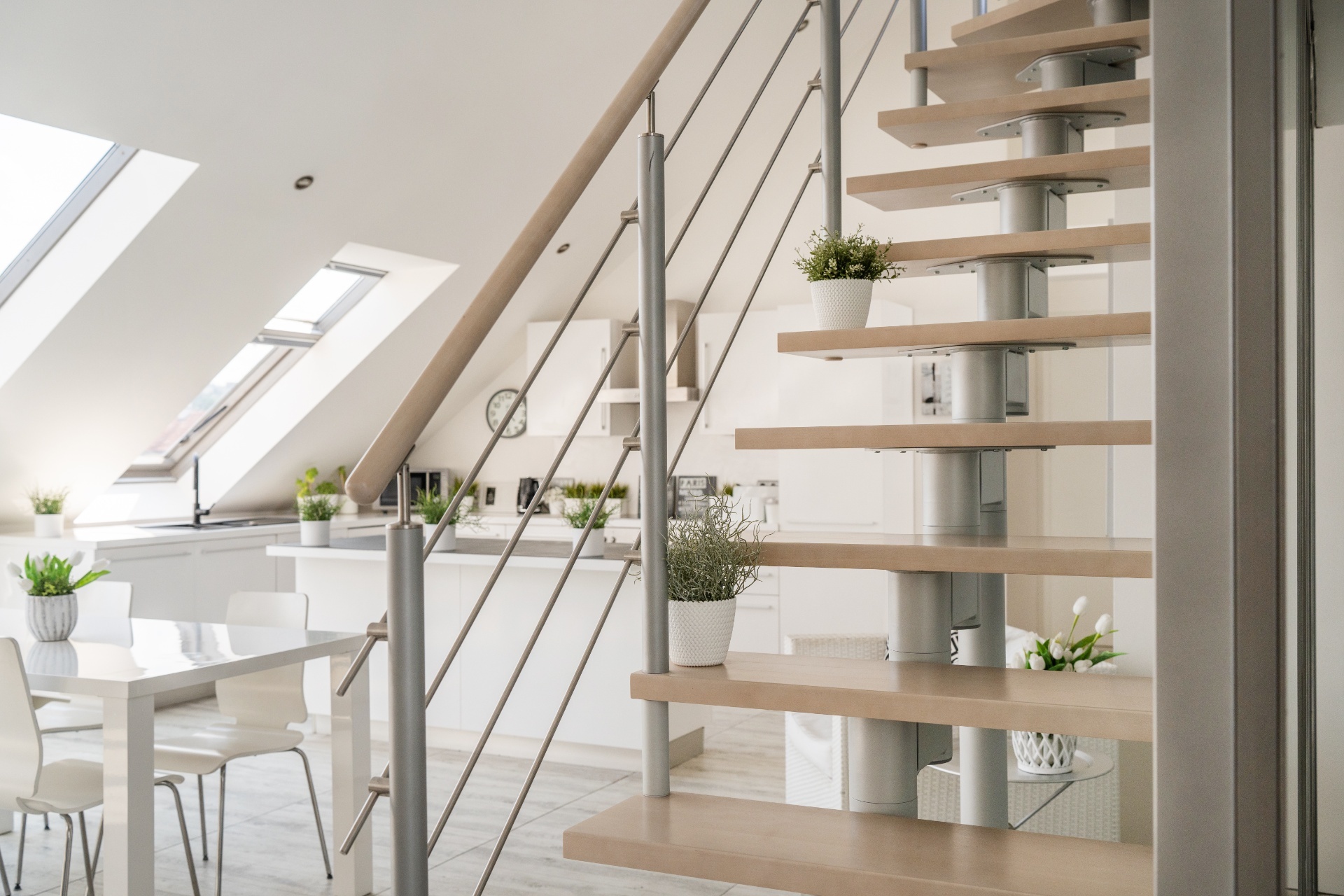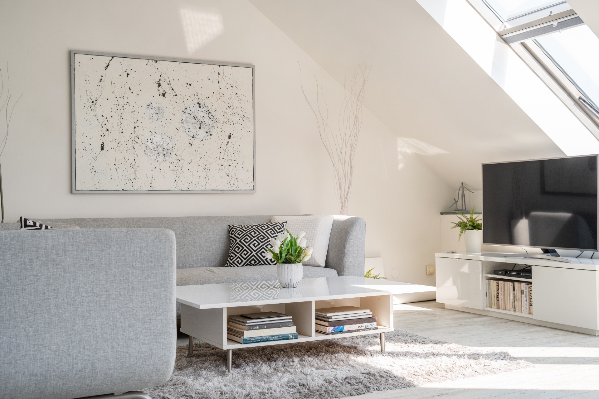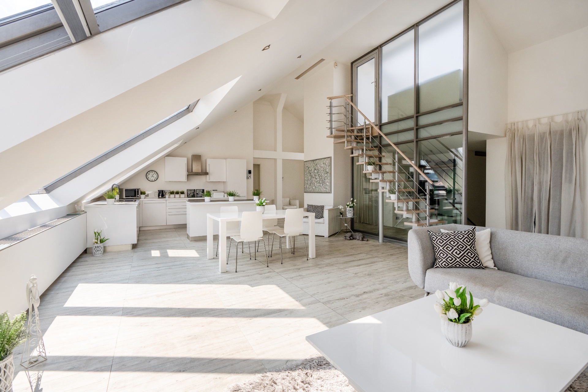 Do bytu se vchází přes vstupní zádveří do prostorného obývacího pokoje s kuchyní a jídelnou (79 m²). Odtud vede moderní schodiště na horní terasu s výhledem na Pražský Hrad a Petřín.
