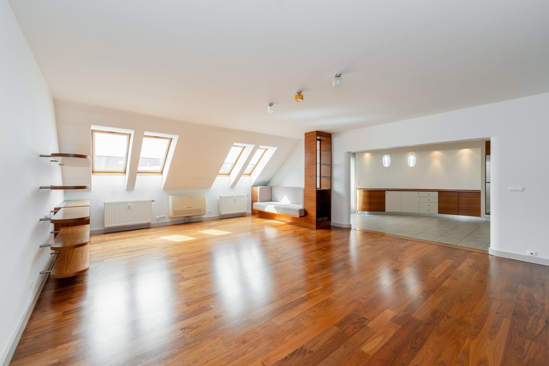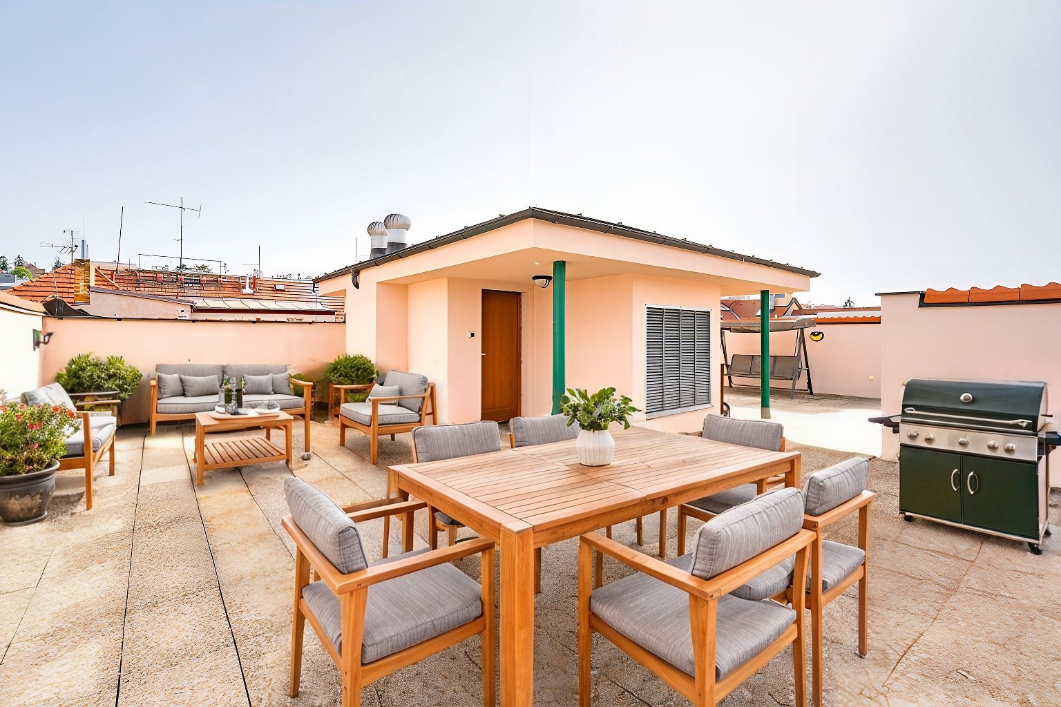 Centrální částí bytu je prostorný obývací pokoj propojený s moderně vybavenou kuchyní, ze které je rovněž přístup na druhý balkon. Pokud vystoupáte po schodišti do druhého podlaží, ocitnete se na střešní terase o rozloze 93 m², která poskytuje výhledy do okolí a stane se Vaším soukromým útočištěm pro relaxaci i společenské akce.