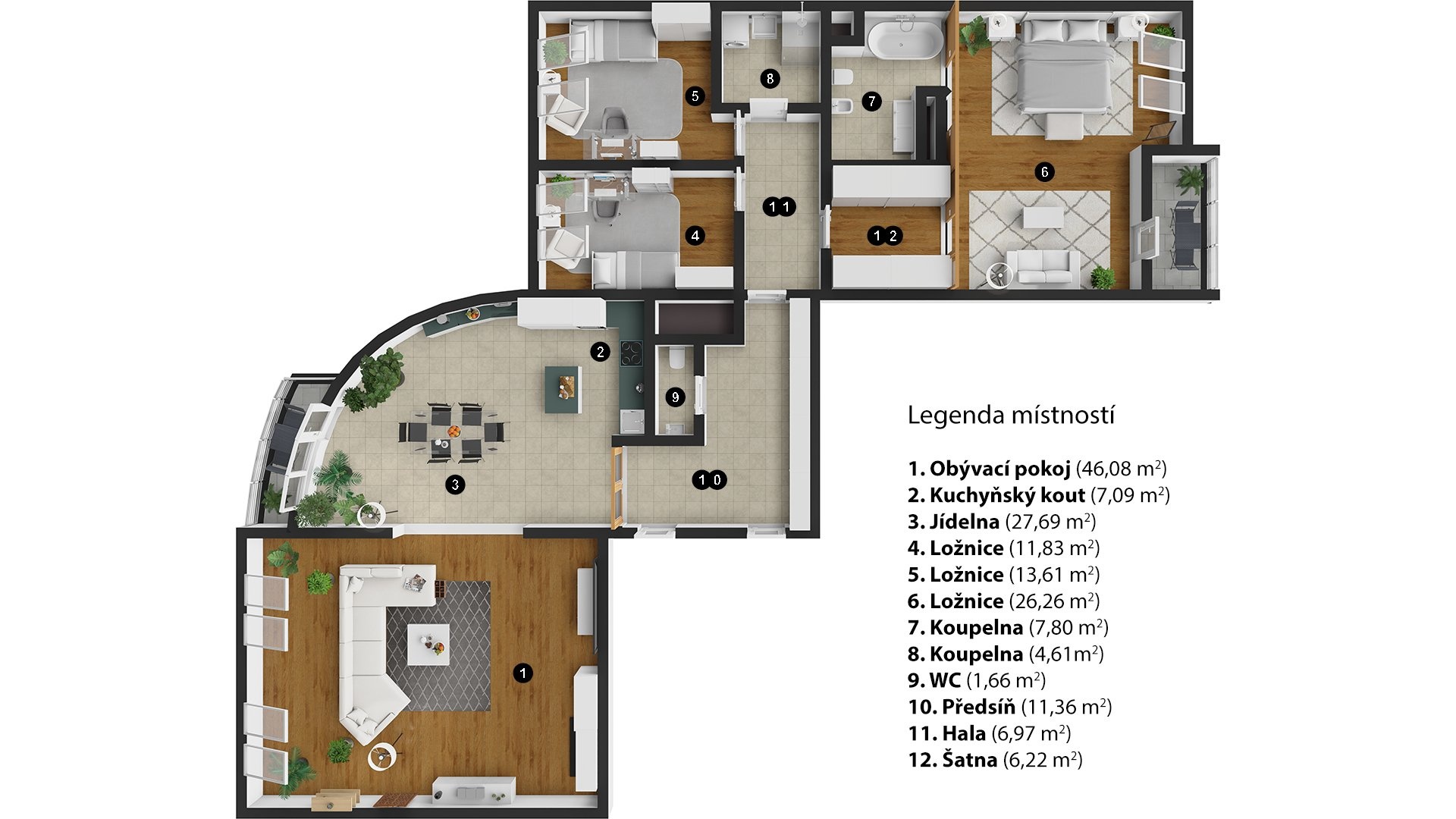 Byt je situován v šestém a sedmém podlaží rezidenčního domu a jeho dispozice je navržena pro maximální pohodlí a funkcionalitu. V prvním podlaží se nachází vstupní hala s vestavěnými skříněmi, master ložnice s přístupem na balkon, která disponuje vlastní koupelnou vybavenou vanou, dvojumyvadlem, toaletou a bidetem. Dále v bytě naleznete další dvě neprůchozí ložnice, koupelnu se sprchovým koutem a samostatnou toaletu.