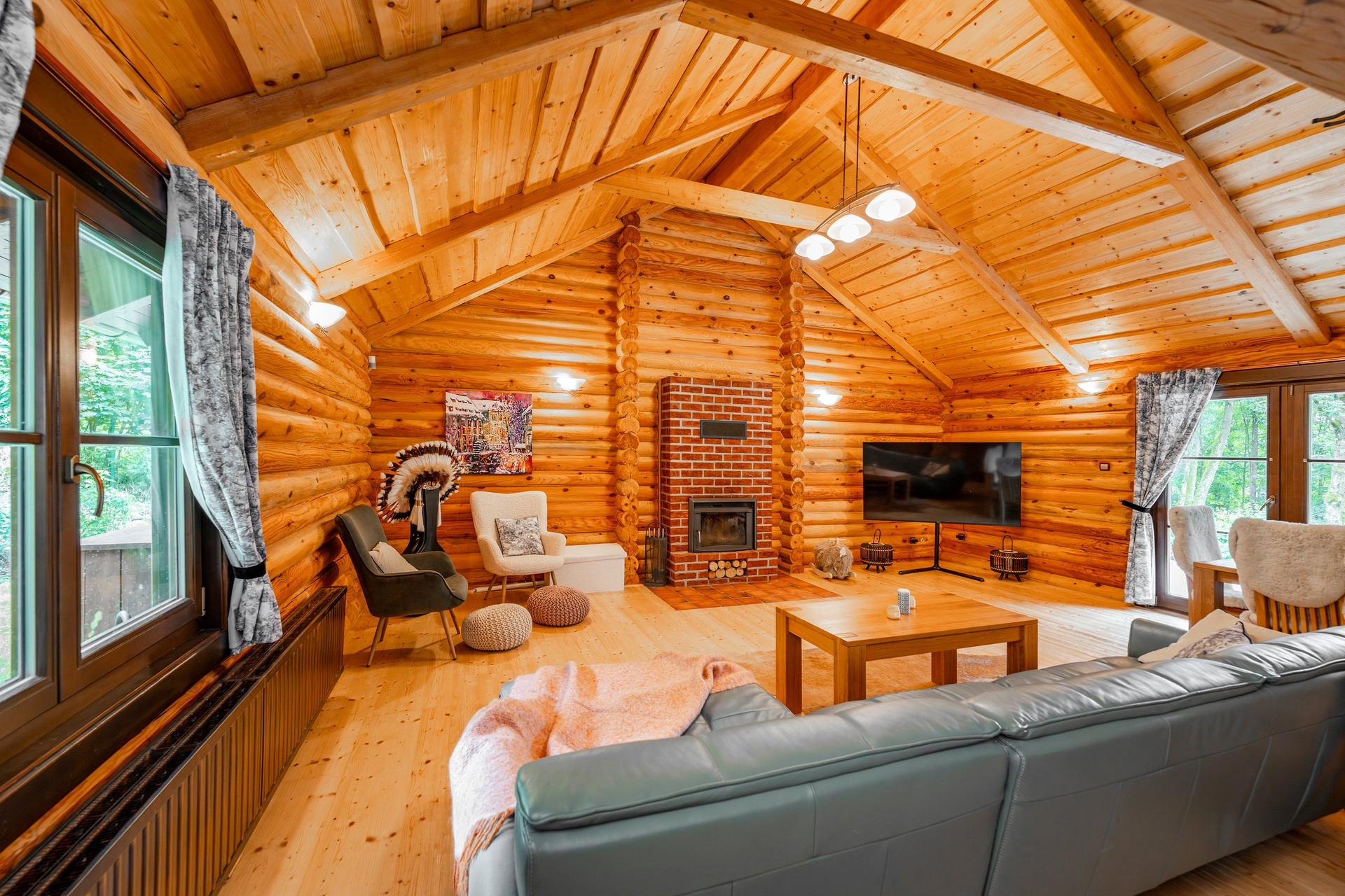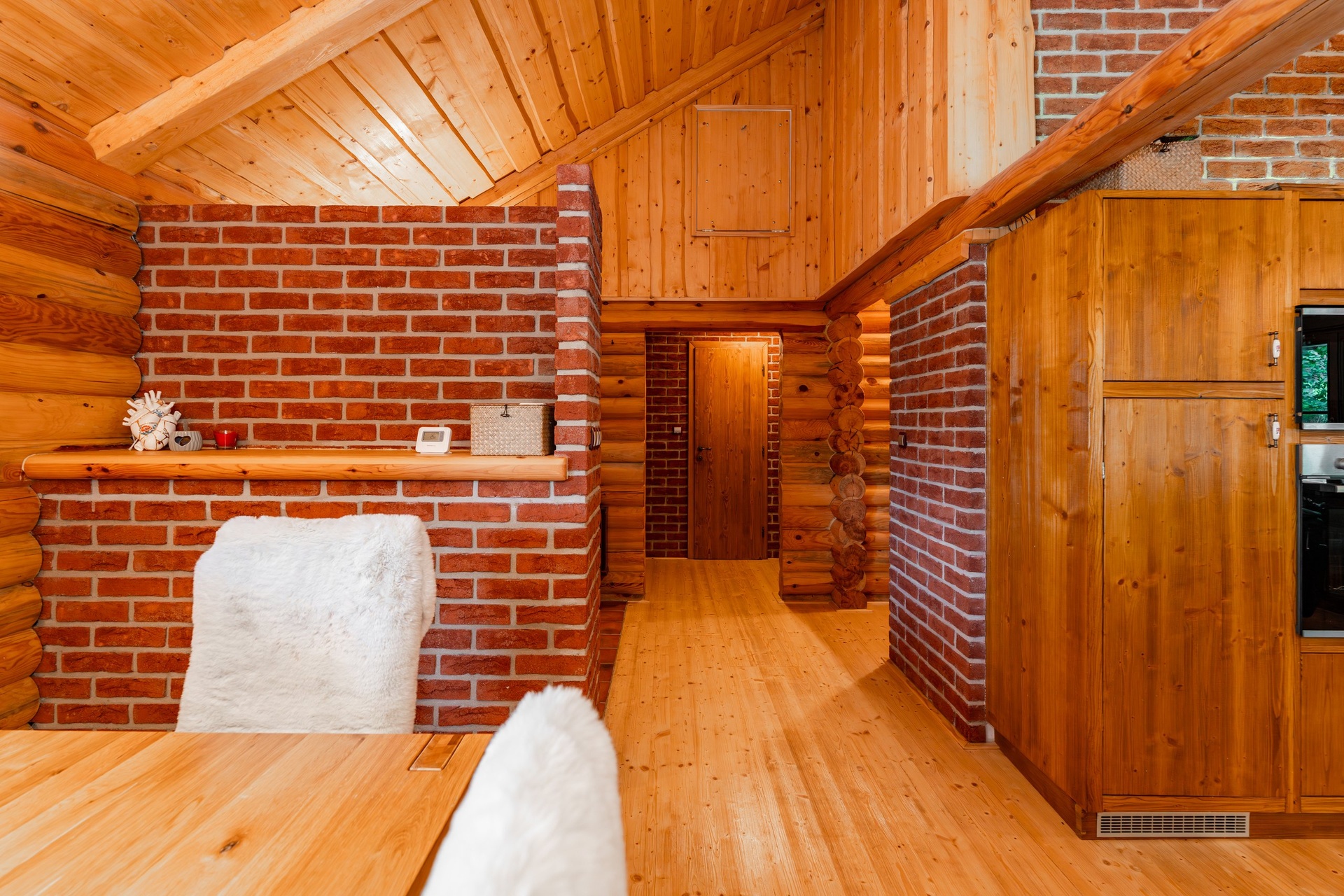 Interiér srubu je prakticky uspořádán. Je zde středová předsíň se základním úložným prostorem a vstupy do všech místností: do dvou samostatných ložnic, koupelny s vanou i sprchou, do samostatné toalety, technické místnosti a především do velkorysého obývacího sálu s krbem a vybavenou kuchyní. Tento prostor je otevřený do hřebene střechy a je rozdělen na jídelní část s výstupem na terasu s výhledem do lesa a na klidnou relaxační část s útulným posezením u krbu. Srub je prosvětlený, nad ložnicovou částí má půdu pro uložení věcí. Nabídka zahrnuje také většinu stávajícího vybavení.