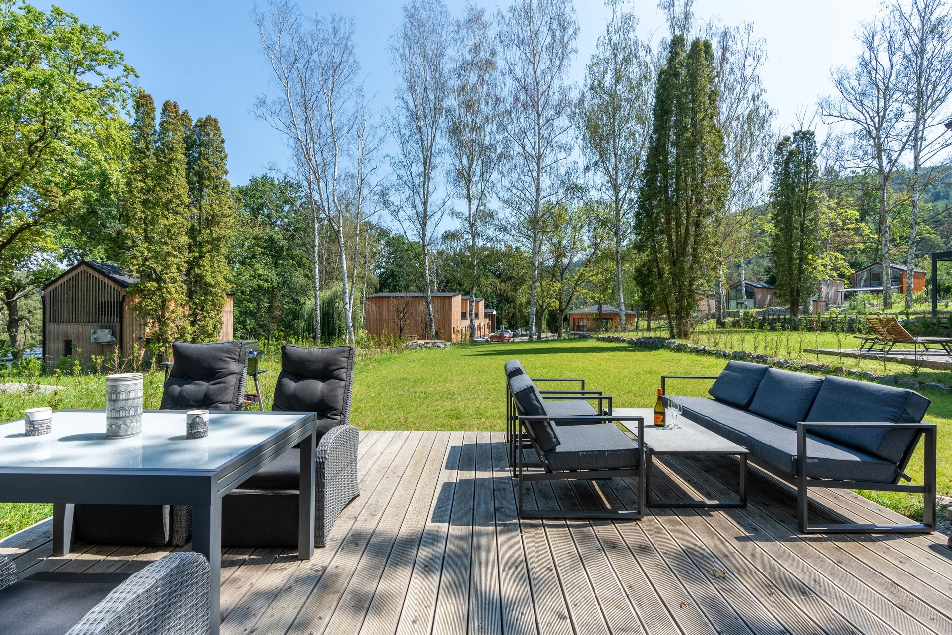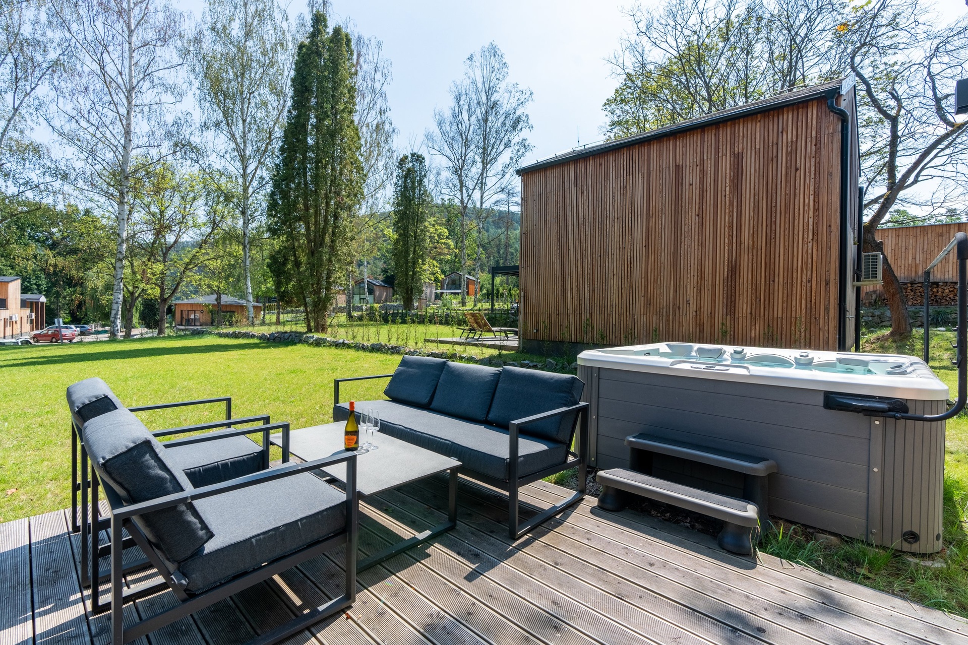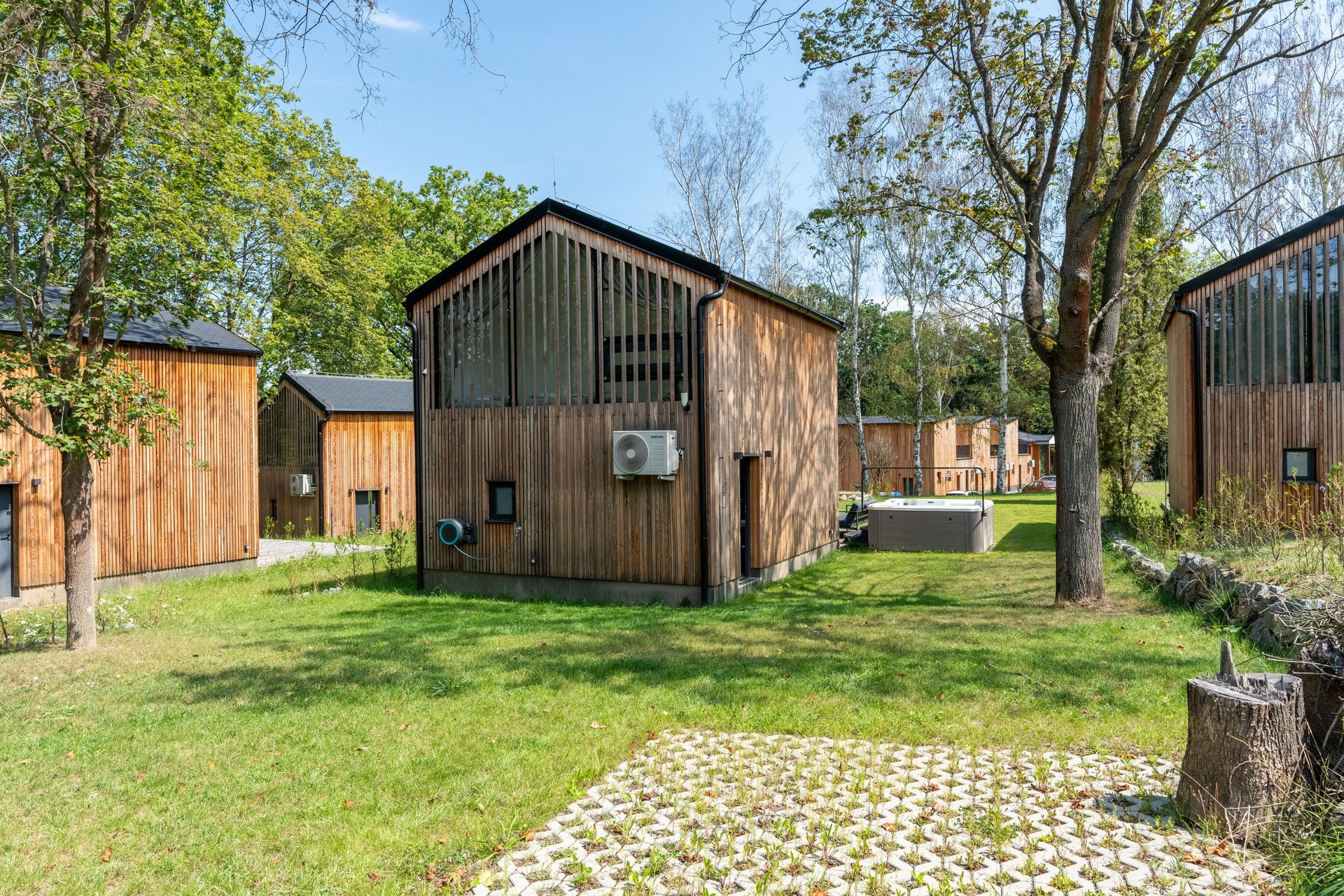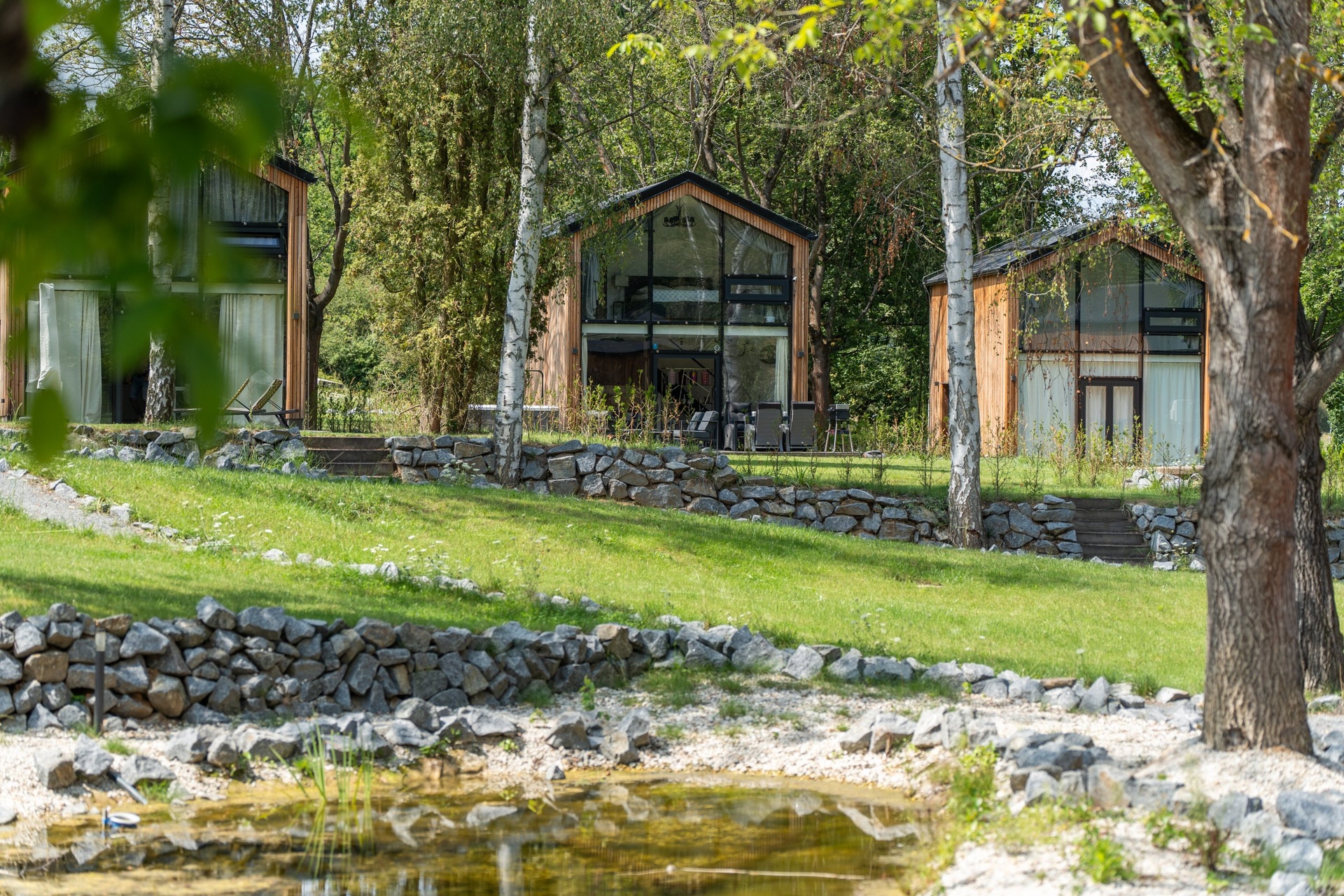 Chata je provedena v moderním, vkusně minimalistickém pojetí, které umožňuje nízkonákladové bydlení s minimálními nároky na údržbu. Materiálové řešení kombinuje dřevěný fasádní obklad, velkoformátová prosklení na čelních fasádách a střešní krytinu z bonnského šindele. Střídmý design čerpá z přírodních materiálů a navazuje na okolní přírodu. Velkoformátová čelní skla umožňují dokonalé prosvětlení vnitřních prostor a otevřené výhledy do okolí, což rezidentům přináší uklidňující pocit, že i doma jsou přirozenou součástí přírody.