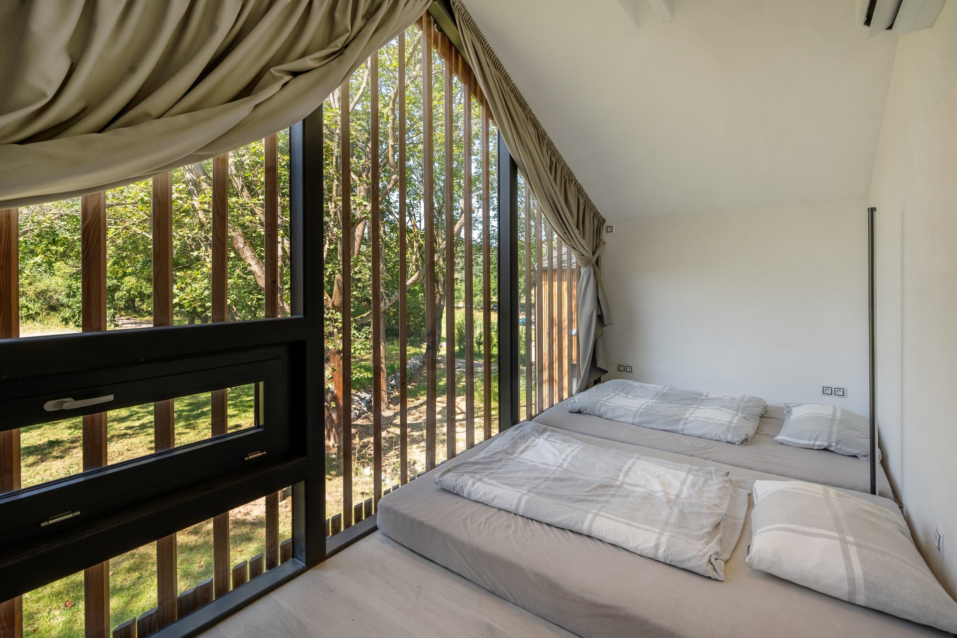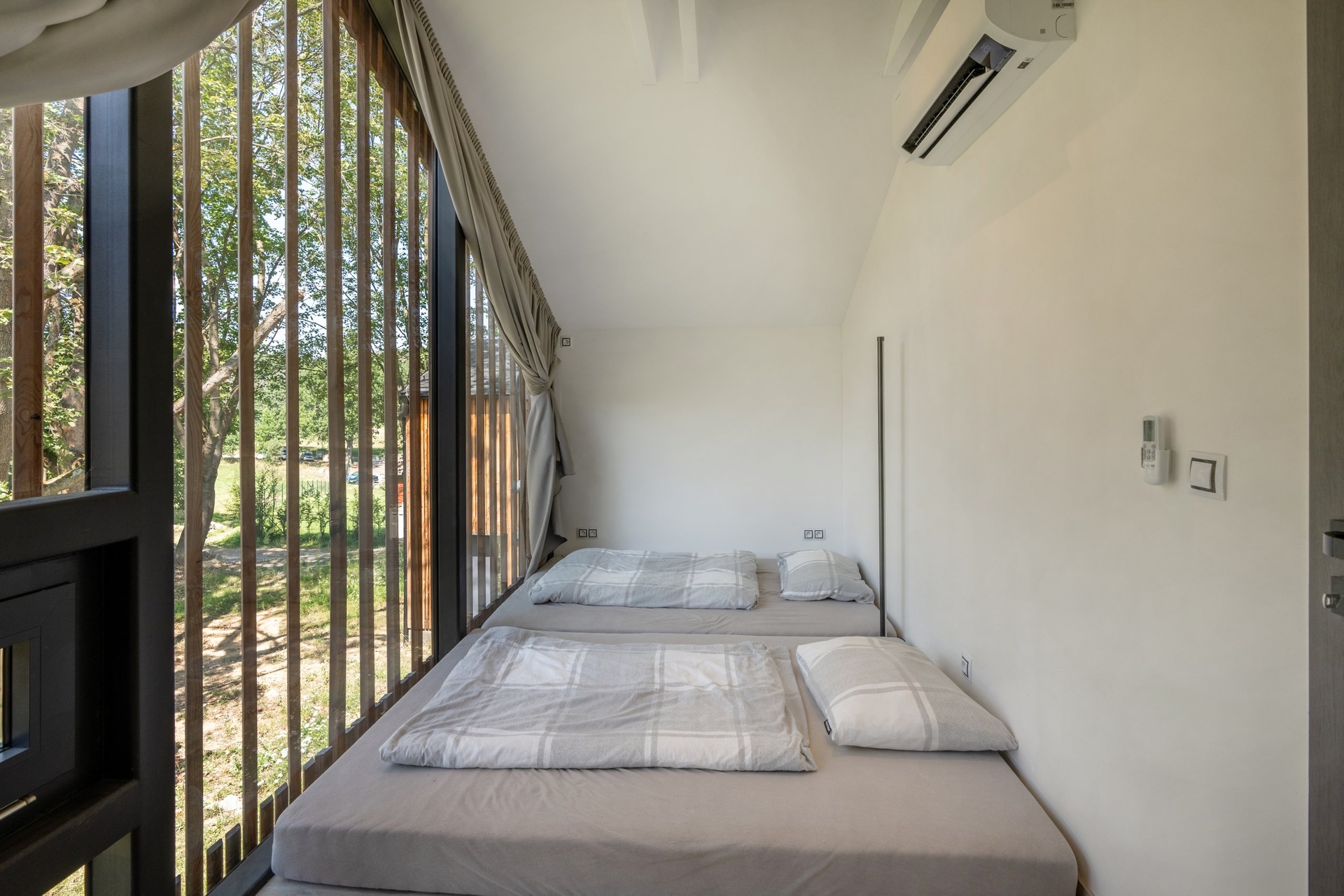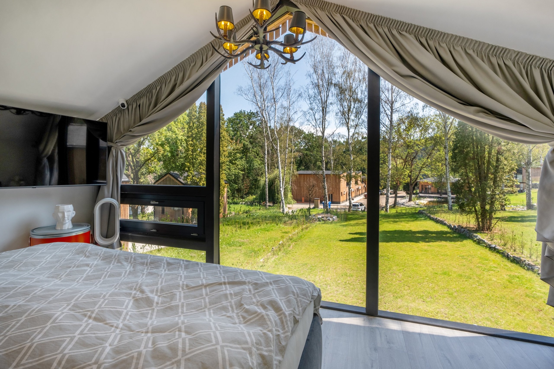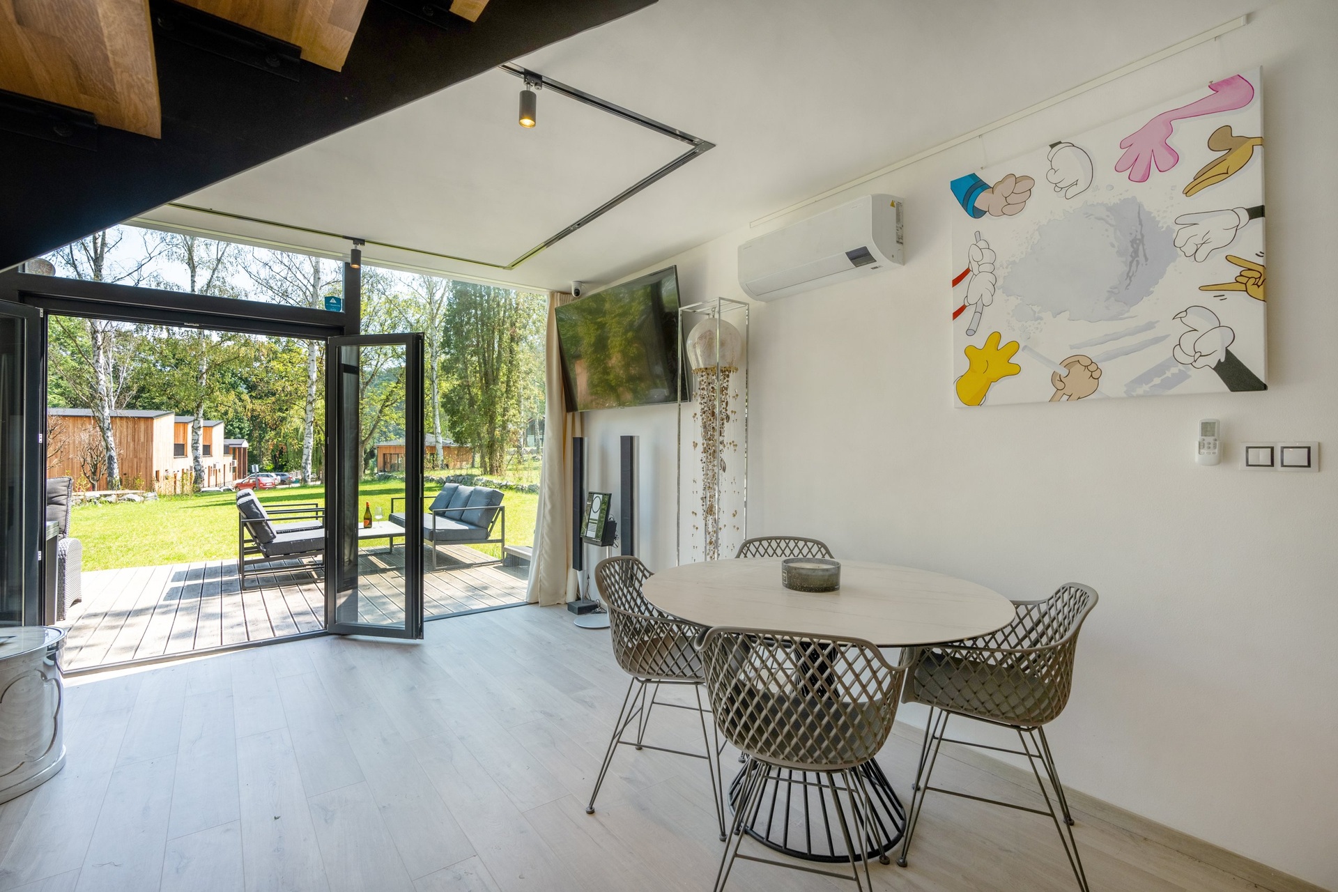 Chata je provedena v moderním, vkusně minimalistickém pojetí, které umožňuje nízkonákladové bydlení s minimálními nároky na údržbu. Materiálové řešení kombinuje dřevěný fasádní obklad, velkoformátová prosklení na čelních fasádách a střešní krytinu z bonnského šindele. Střídmý design čerpá z přírodních materiálů a navazuje na okolní přírodu. Velkoformátová čelní skla umožňují dokonalé prosvětlení vnitřních prostor a otevřené výhledy do okolí, což rezidentům přináší uklidňující pocit, že i doma jsou přirozenou součástí přírody.