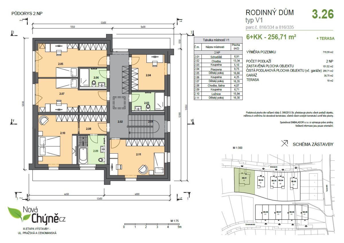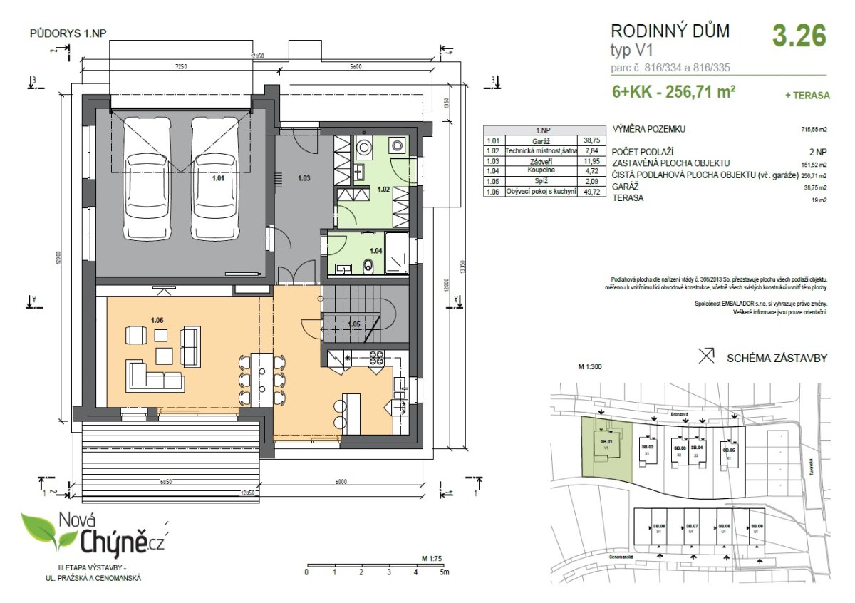 Na západním okraji Prahy s dojezdem 14 km do centra Prahy nabízíme v projektu Nová Chýně velkorysý rodinný dům se zahradou, dvougaráží a dvěma parkovacími stáními. Výjimečný dům v tomto projektu zejména svou polohou (je rohový s větším pozemkem), stavebně-technickou kvalitou, skvělými dispozicemi se třemi koupelnami a dostatkem úložných prostor i přípravou na FVE. Dispozice 6+kk je rozložena ve dvou NP na celkové podlahové ploše 256,7 m2 a užitné ploše 249 m2, vč. terasy 19 m2. Celková rozloha pozemku činí 715,6 m2, z čehož zastavěná plocha je 151,5 m2 a zahrada 564 m2. Součástí domu je dvougaráž a další park. stání na vlastním pozemku.
