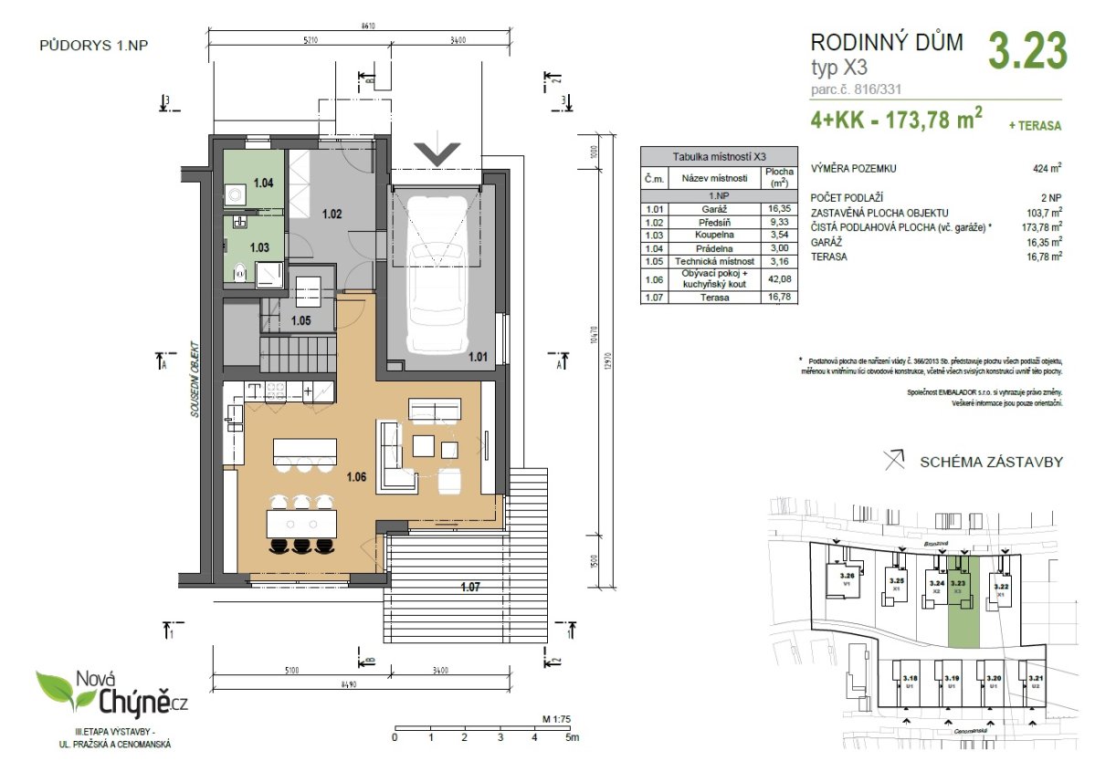 Nabízíme rodinný dům se slunnou zahradou v projektu Nová Chýně, na západním okraji Prahy – ve městě Chýně – s dojezdem 14 km do centra Prahy. Projekt uspokojí lokalitou, kvalitou zděných domů s praktickými dispozicemi a zahradami i technologickou promyšleností. Nabízený rodinný má dispozici 4+kk, podlahovou plochu 173,8 m2, terasu 16,8 m2. Stojí na pozemku o rozloze 424 m2 se zahradou 320 m2. Součástí domu je garáž pro jeden vůz a jedno další park. stání je na vlastním pozemku.