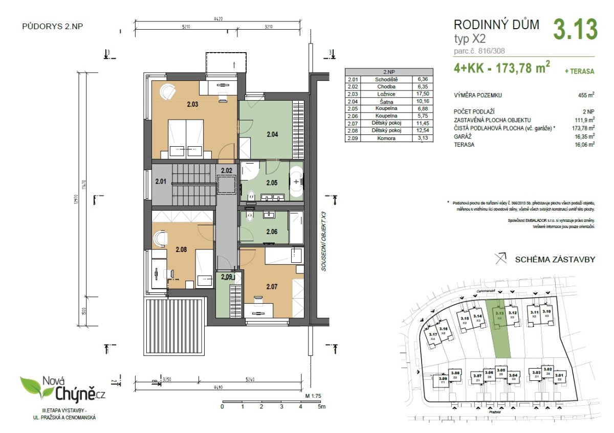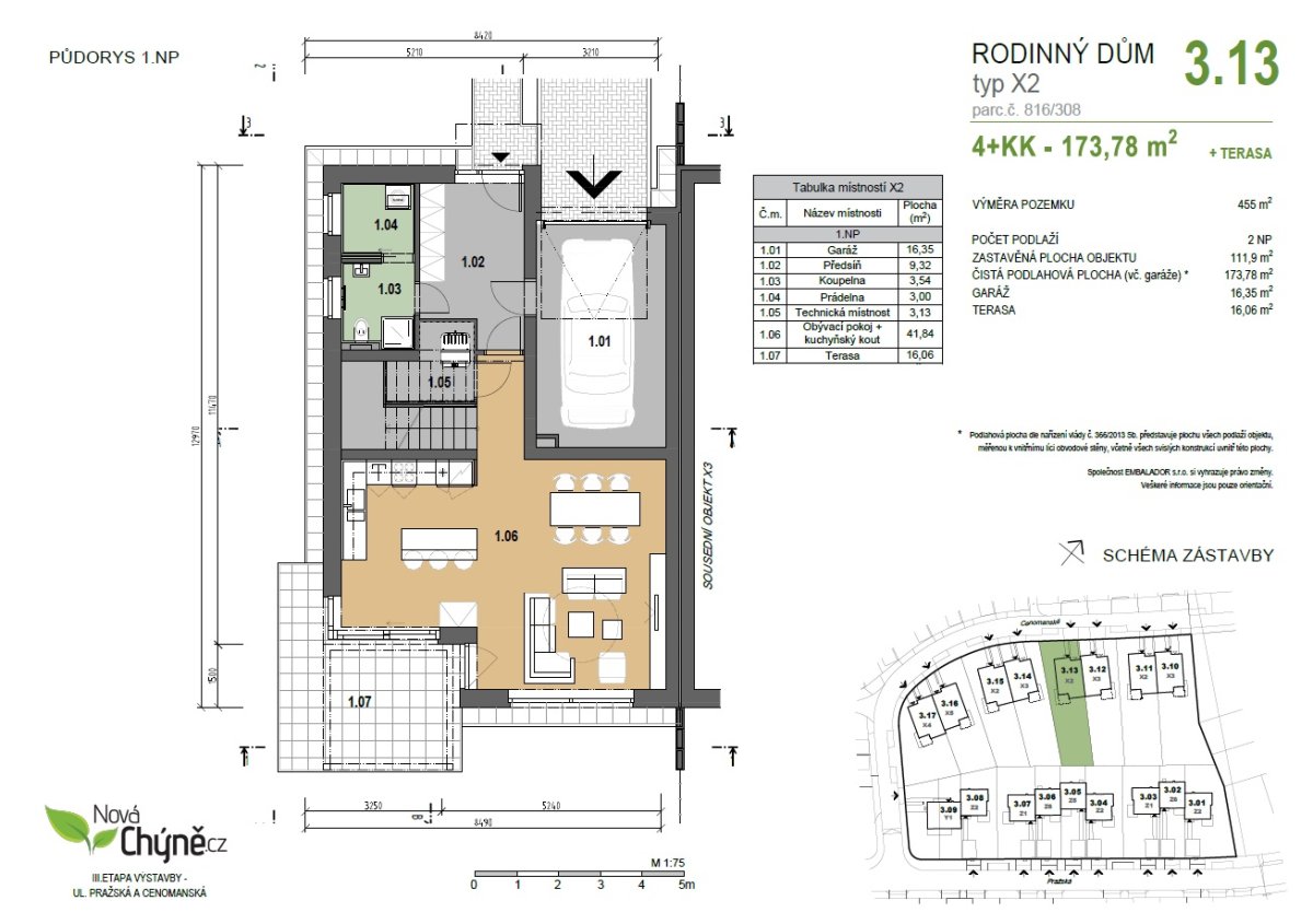 Nabízíme energeticky úsporný rodinný dům se zahradou v projektu NOVÁ CHYNĚ, na západním okraji Prahy – ve městě Chýně – s dojezdem 14 km do centra Prahy. Projekt uspokojí lokalitou, kvalitou zděných domů s praktickými dispozicemi a zahradami i technologickou promyšleností. Nabízený rodinný dům je zděný, má dispozici 4+kk+G, podlahovou plochu 173,8 m2, celkovou užitnou plochu 173,4 m2, z toho terasu 16 m2. Stojí na pozemku o rozloze 455 m2 se zahradou 343 m2. Součástí domu je garáž pro jeden vůz a jedno další park. stání je na vlastním pozemku.