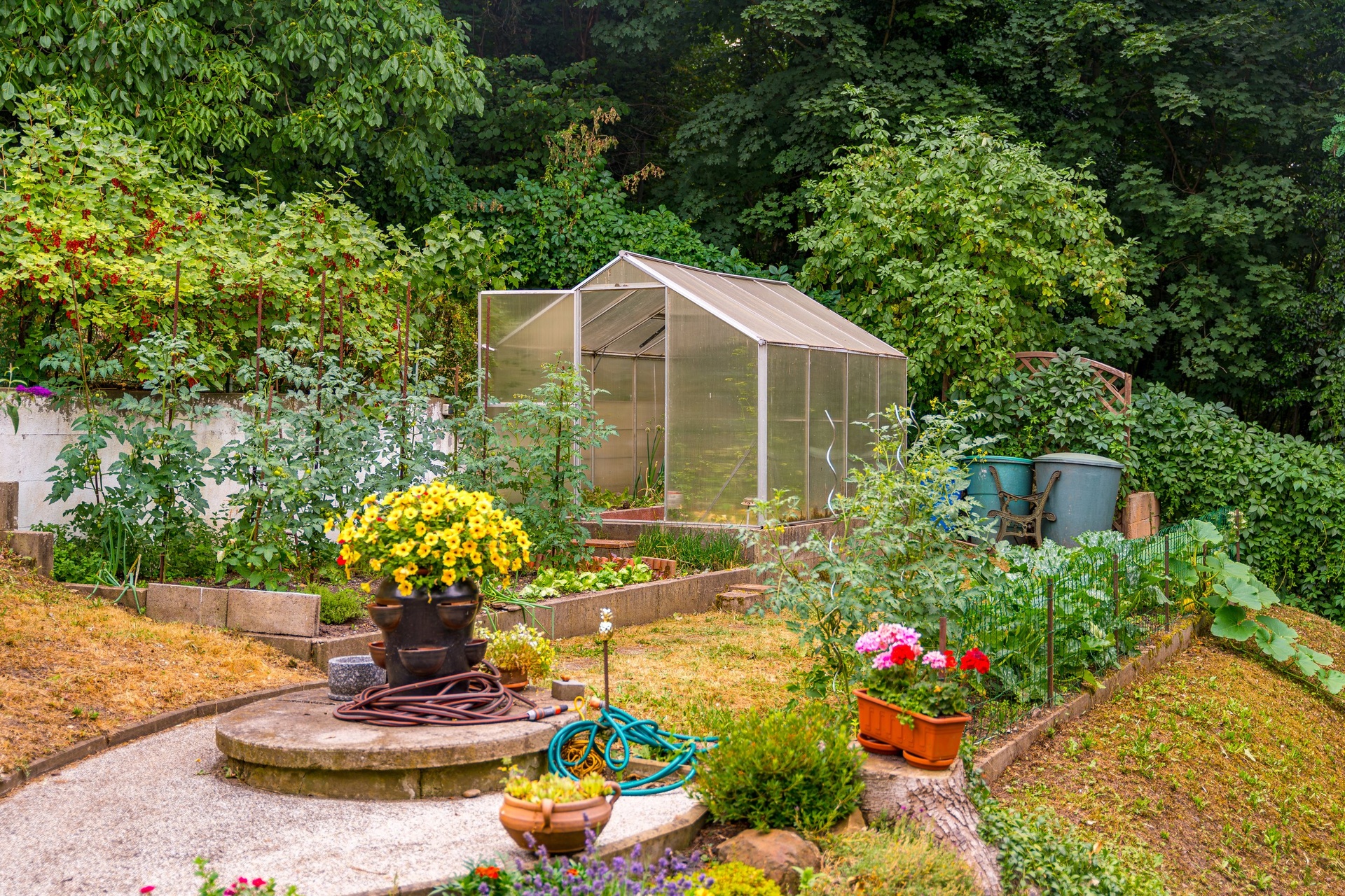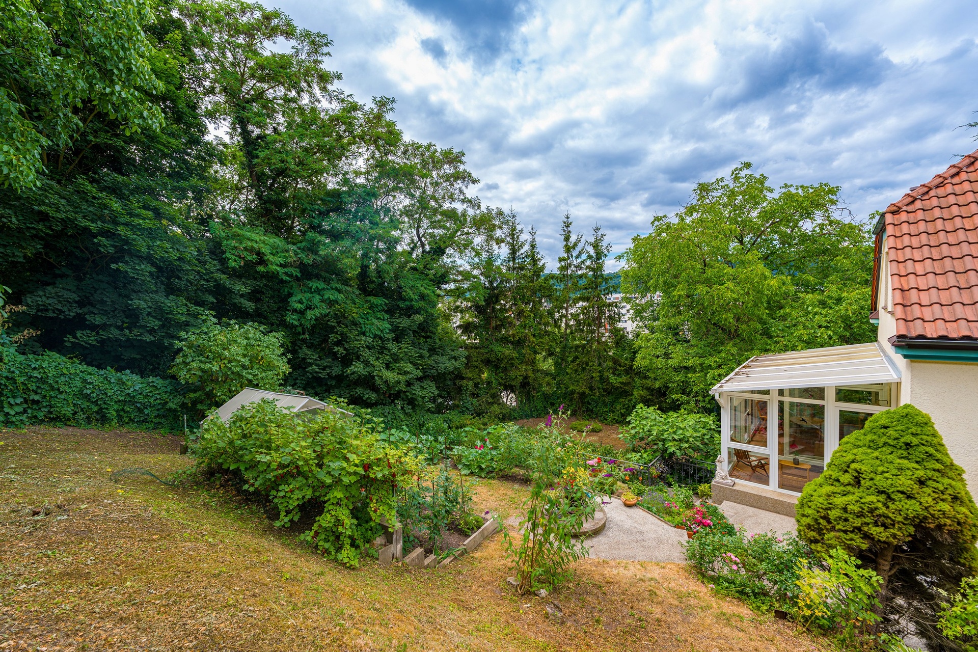 Zahrada je díky svažitému terénu členitě řešená a nabízí řadu příjemných zákoutí. Najdete zde pergolu s posezením, venkovní sklípek, úložný prostor na zahradní náčiní, a také prostor pro pěstování zeleniny, ovoce a květin.