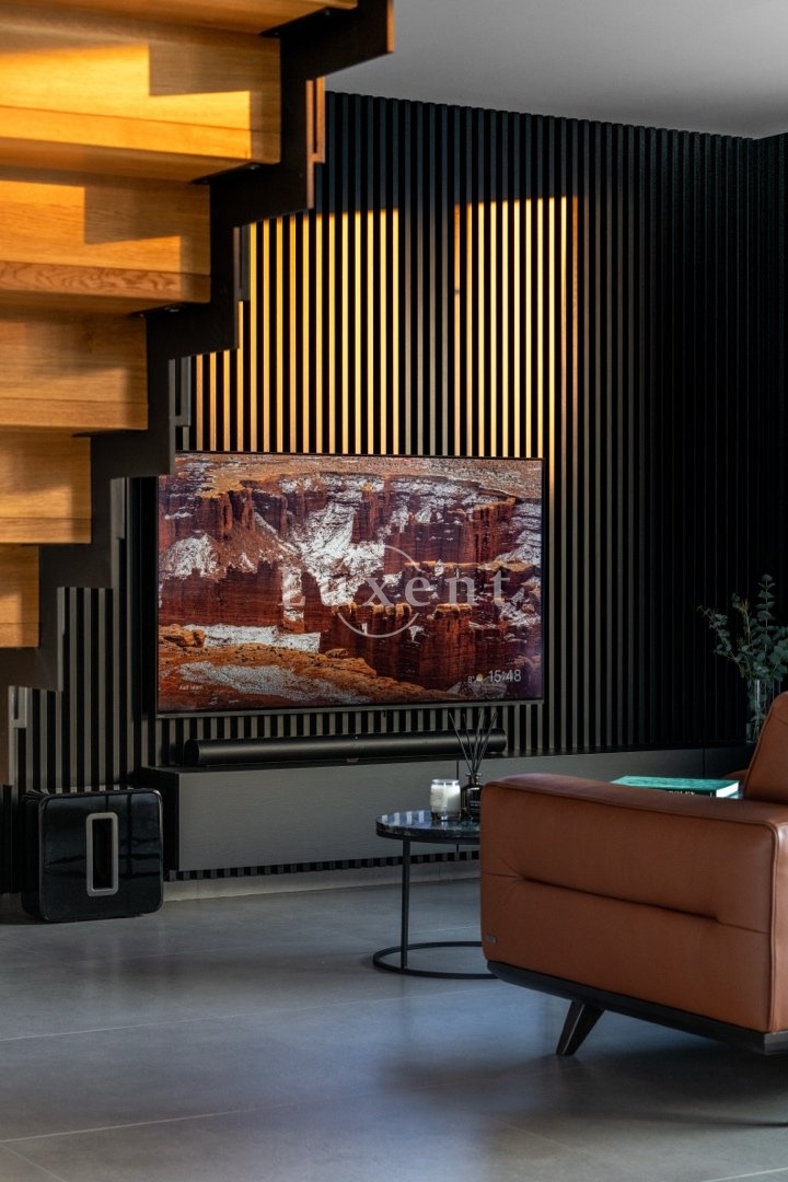 V 1.NP je prostorná předsíň s vestavěnými šatními skříněmi, pokoj pro hosty (12 m²), koupelna se sprchovým koutem a toaletou, technická místnost a elegantní minimalistická kuchyň s jídelním koutem (27 m²), na kterou navazuje prosvětlený obývací pokoj s krbem ( 38,5 m²). Z obývacího pokoje je přístup na terasu, která má na západní části instalovanou bioklimatickou pergolu s LED osvětlením. Celé 1.NP má italskou velkoformátovou dlažbu 90x90cm.