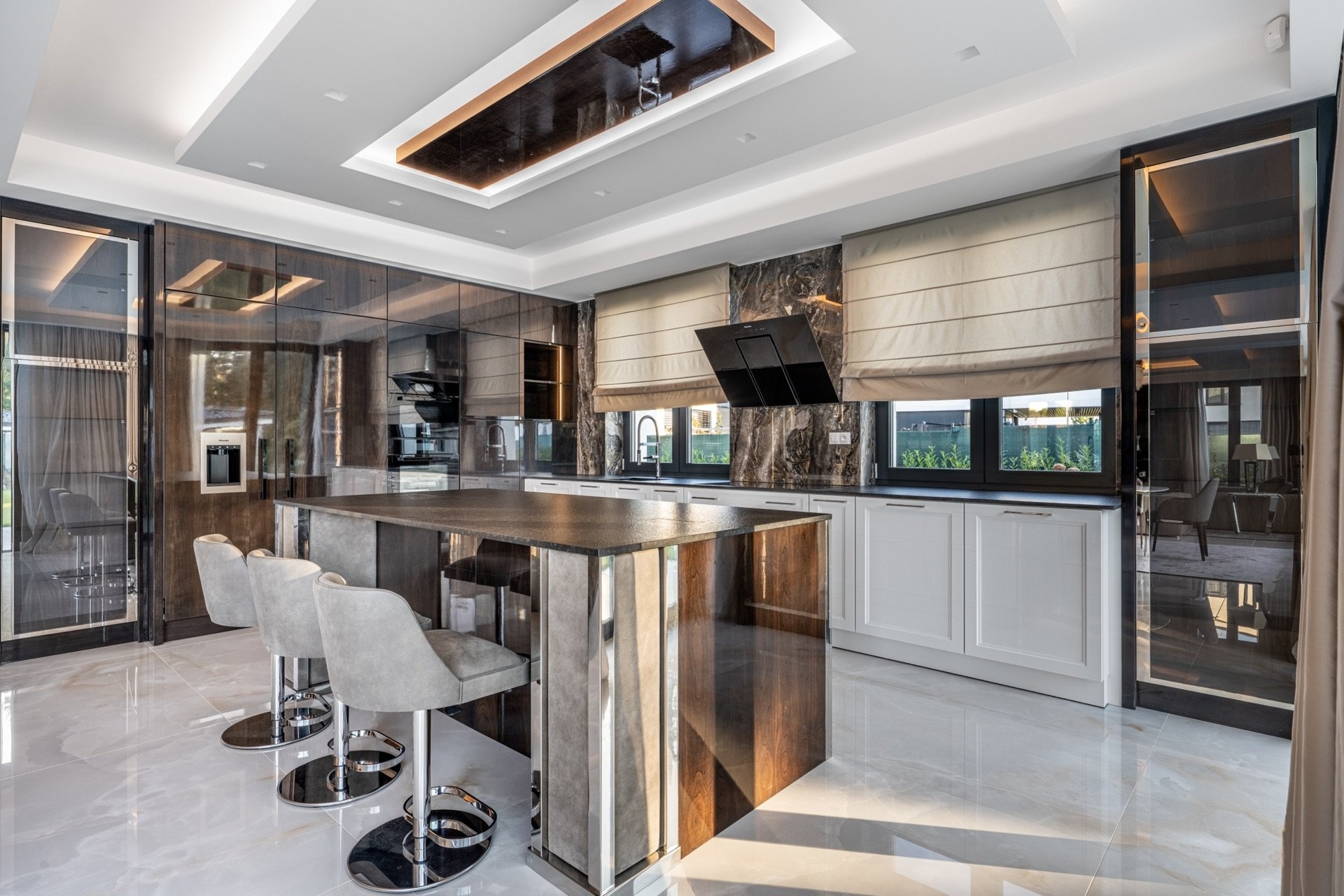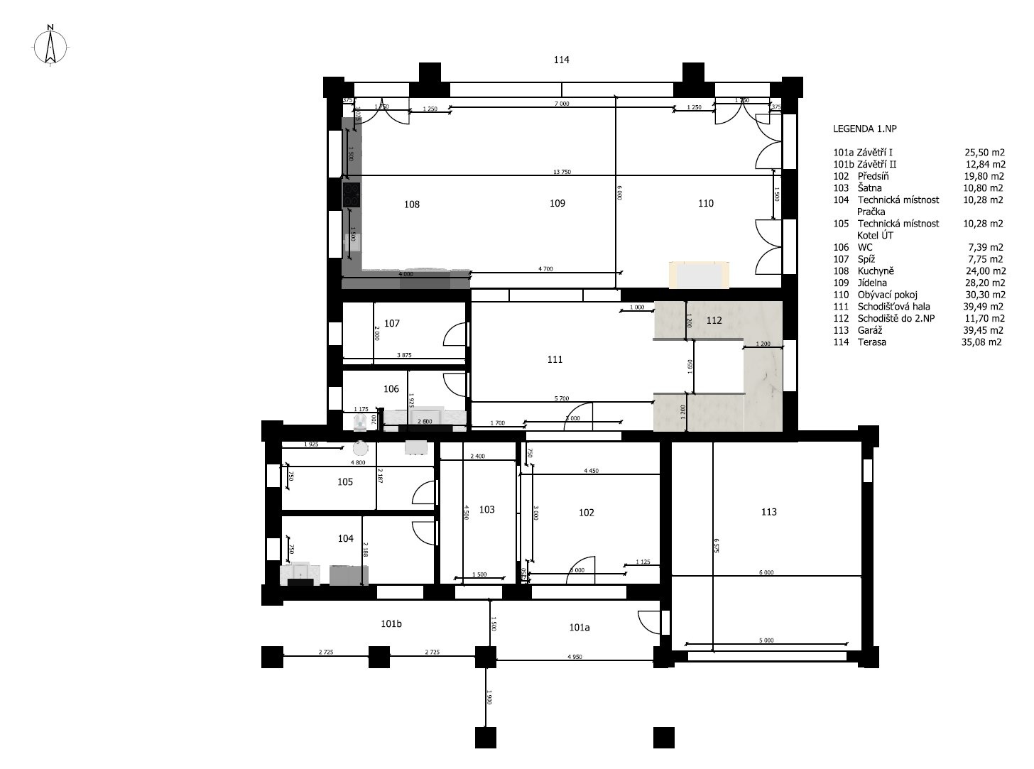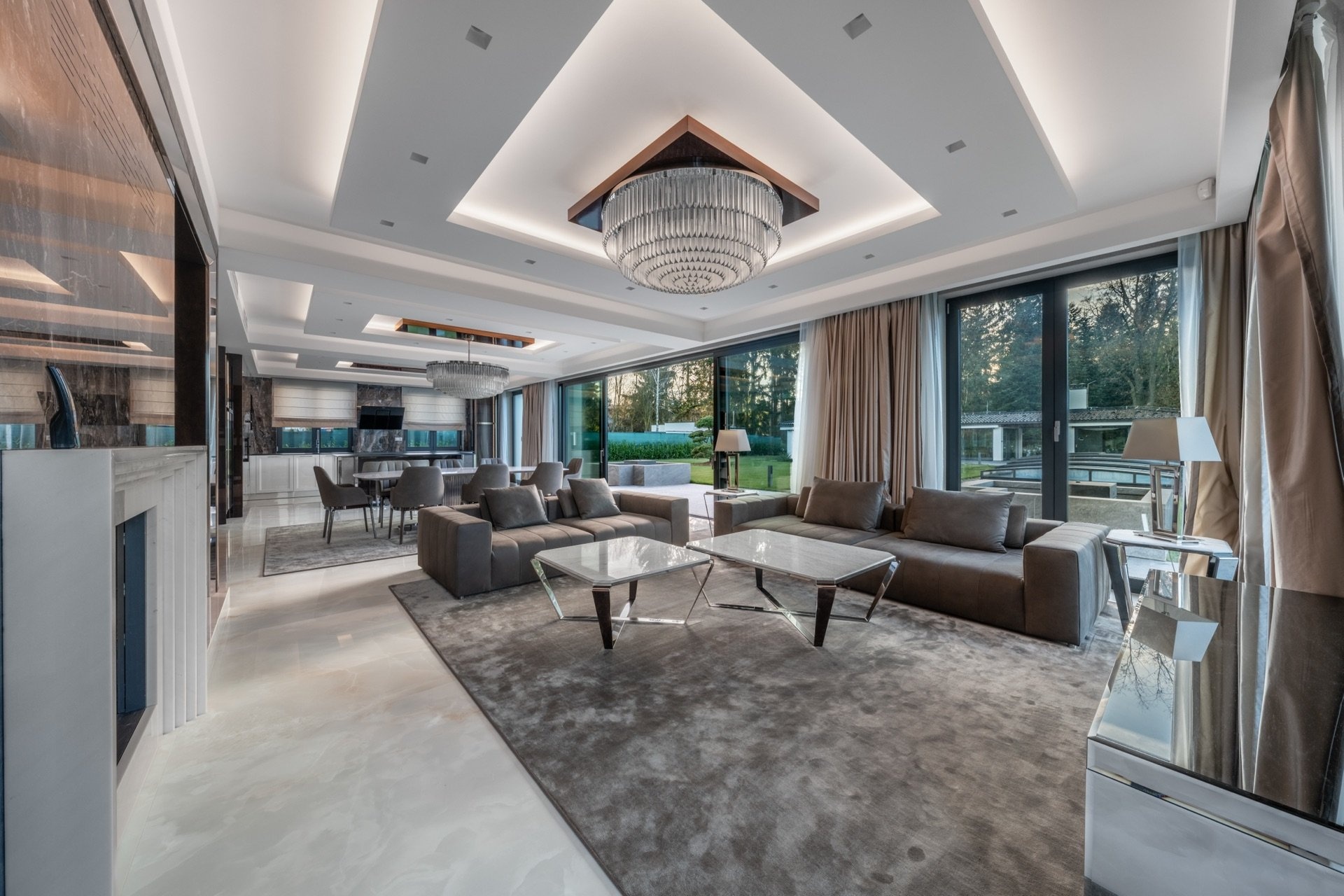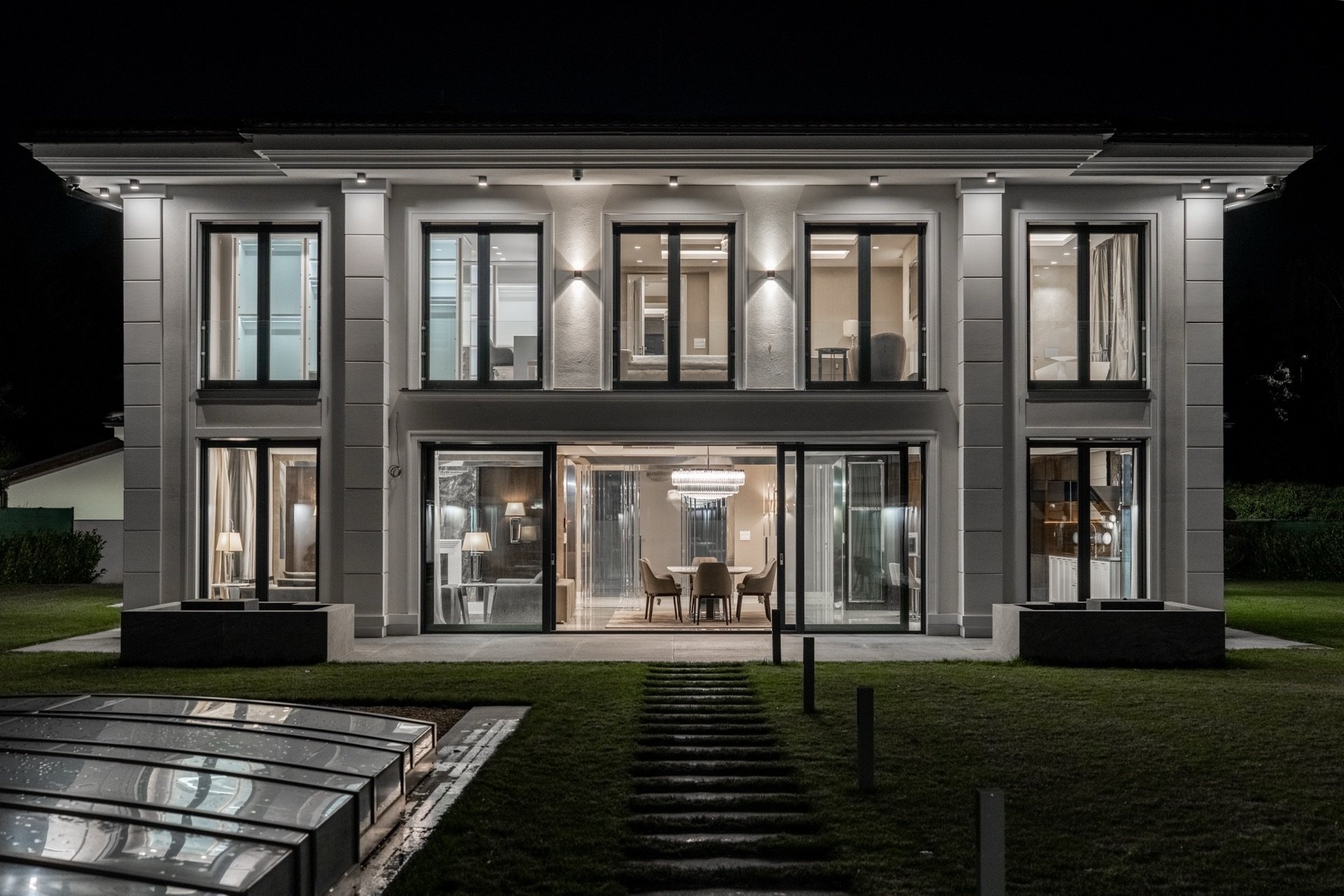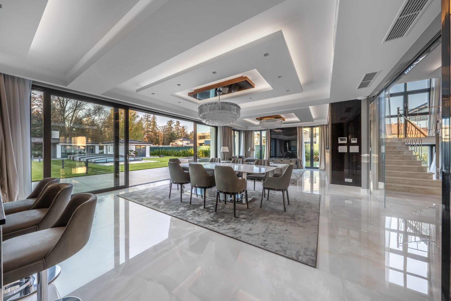 Vstupní část tvoří předsíň a prostorná hala s úložnými prostory a skleněnými posuvnými dveřmi, která plynule přechází do otevřeného společenského prostoru. Dominantou je prémiová kuchyně SieMatic se spotřebiči Miele, navazující jídelna s masivním stolem Wedge a velkorysý obývací pokoj s moderním krbem. Celý prostor prosvětlují velkoformátová francouzská okna, jež zároveň propojují interiér se zahradou a dodávají místnostem výjimečnou vzdušnost. Atmosféru podtrhují ručně vyráběné křišťálové lustry na míru. V prvním podlaží se dále nachází technická místnost, prádelna, spíž a samostatná toaleta.