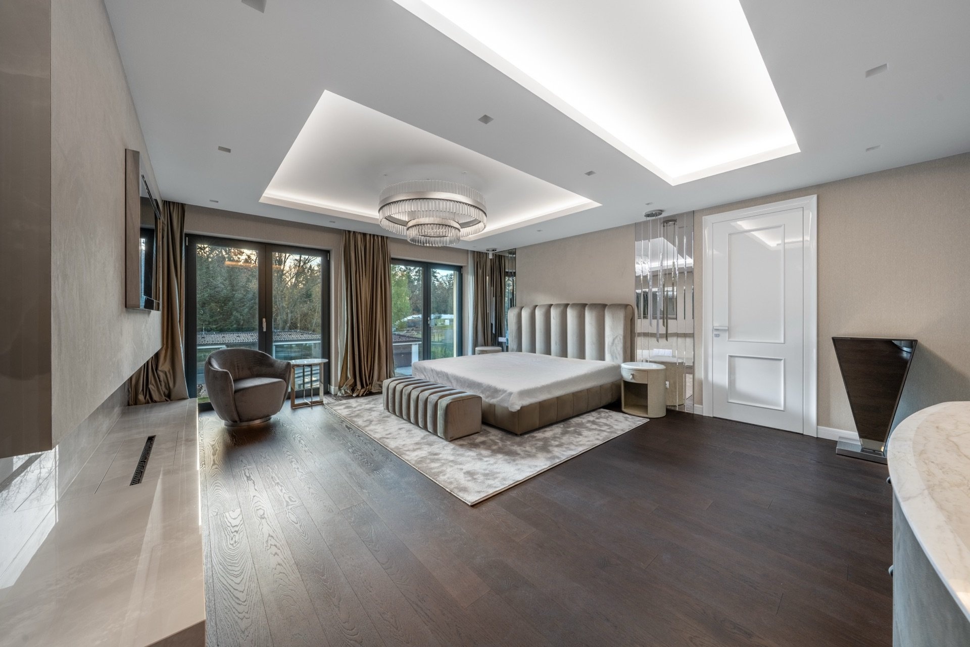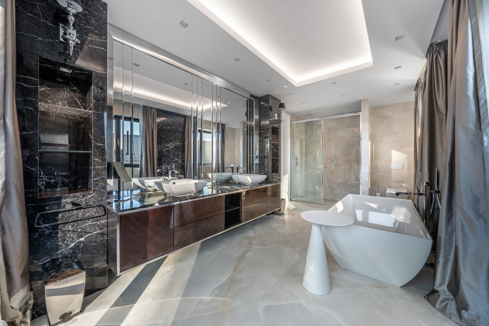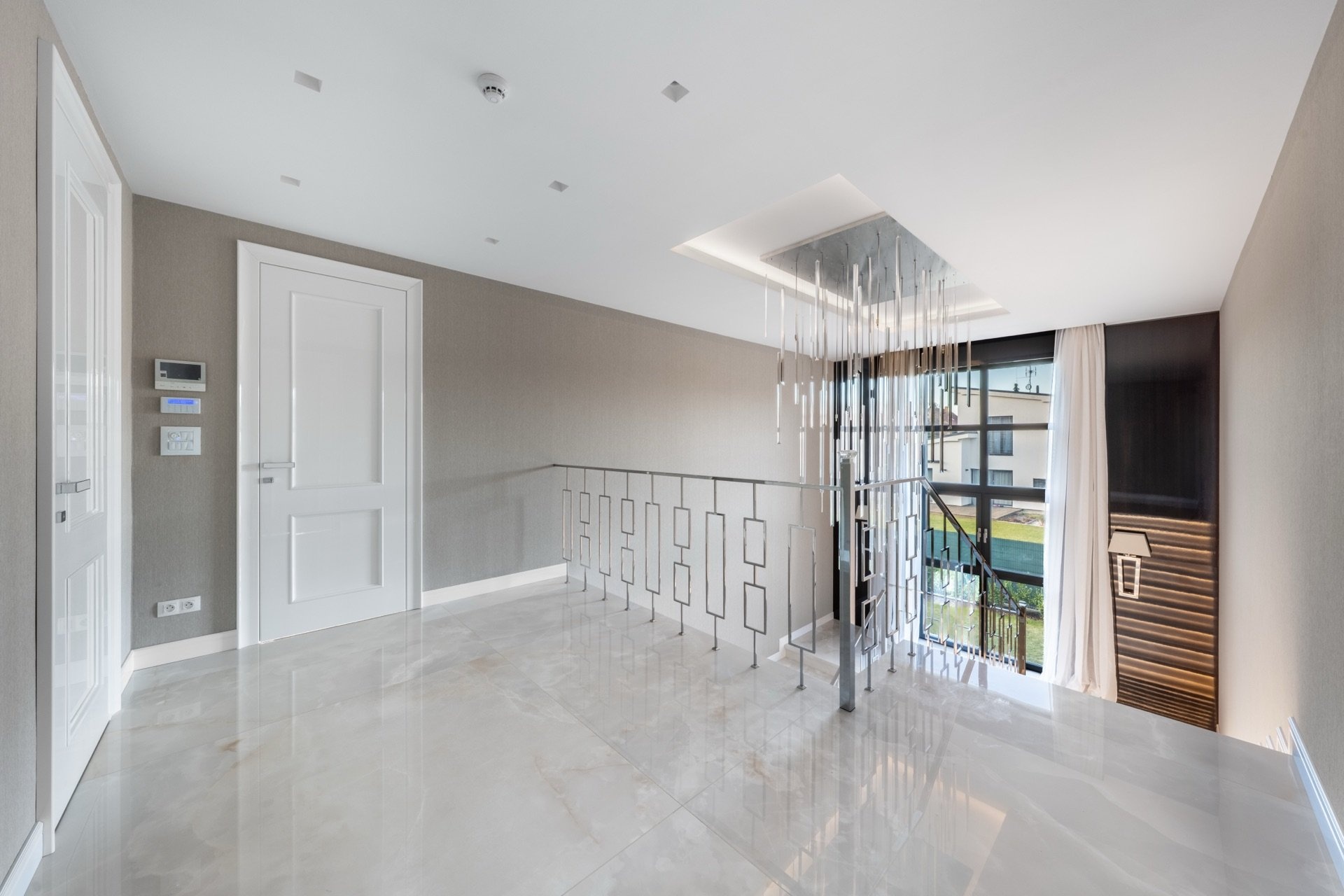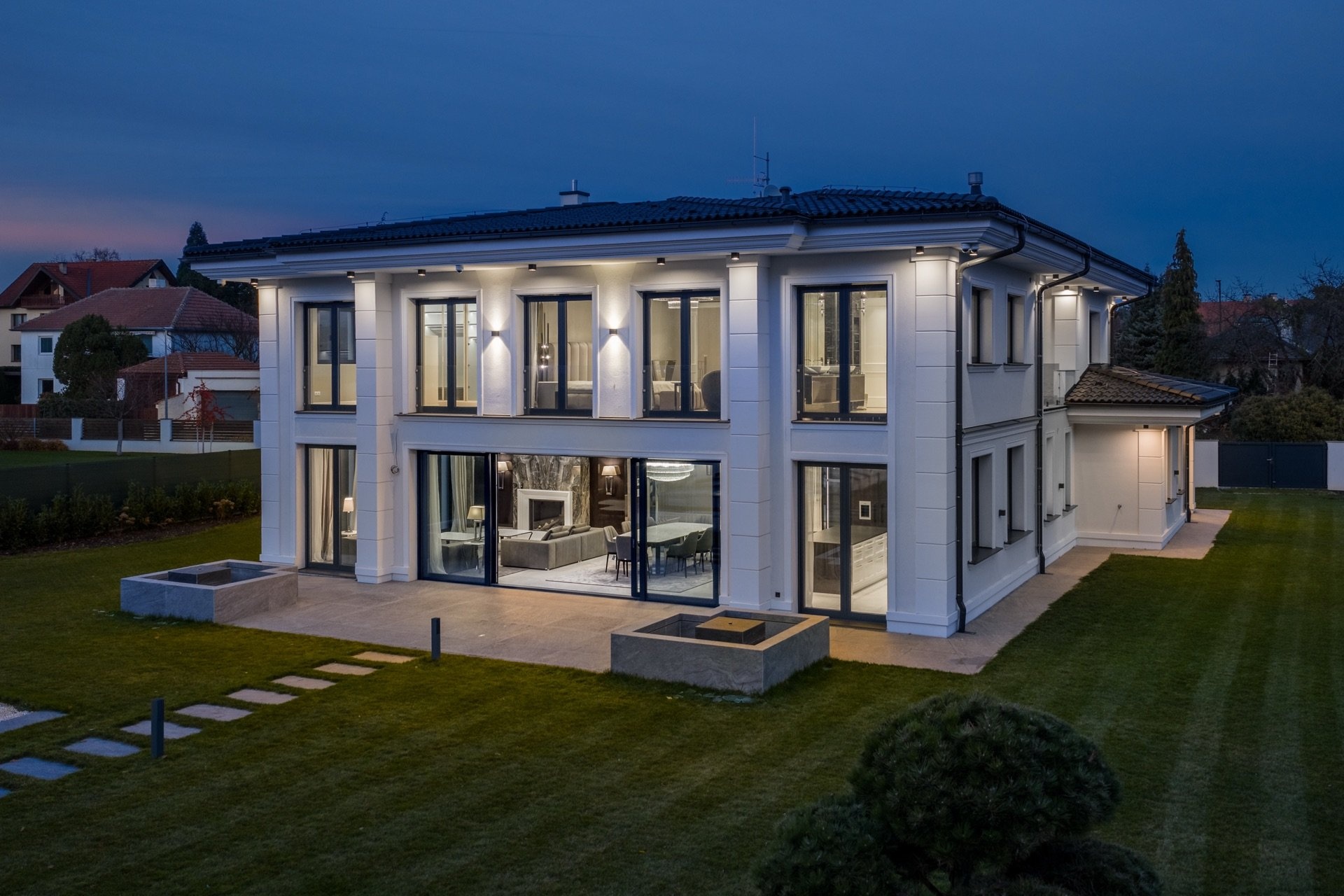 V prvním patře se nacházejí dvě hlavní ložnice, každá s vlastní šatnou, dále dvě luxusní koupelny vybavené sanitou Gessi, volně stojící vanou či walk-in sprchou. Součástí je také pracovna (možné užívat jako další ložnici) a dvě terasy, které poskytují prostor pro odpočinek i práci v soukromí. Pro potřeby další ložnice je možné provést dispoziční úpravu. Dům je vybaven smart home systémem, klimatizací, podlahovým vytápěním a elektronicky ovládanými venkovními žaluziemi i interiérovými závěsy. Pro maximální pohodlí je připravena studie na instalaci výtahu. Bezpečnost zajišťuje rozsáhlý kamerový systém i zabezpečovací zařízení. Součástí nemovitosti je rovněž garáž pro dva vozy, další čtyři auta je možné parkovat před domem na zpevněné ploše či realizovat konstrukční zastřešení.