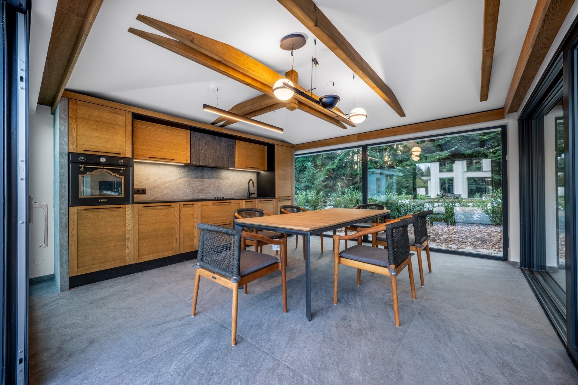 Součástí pozemku je privátní wellness zóna s vyhřívaným bazénem (8x4m), finskou saunou, letní kuchyní a stylovou odpočinkovou místností s mechovou stěnou a krbem, která nabízí perfektní zázemí pro relaxaci i společenské setkávání.