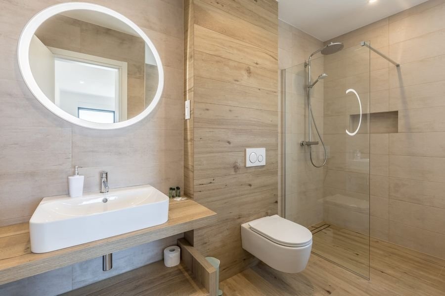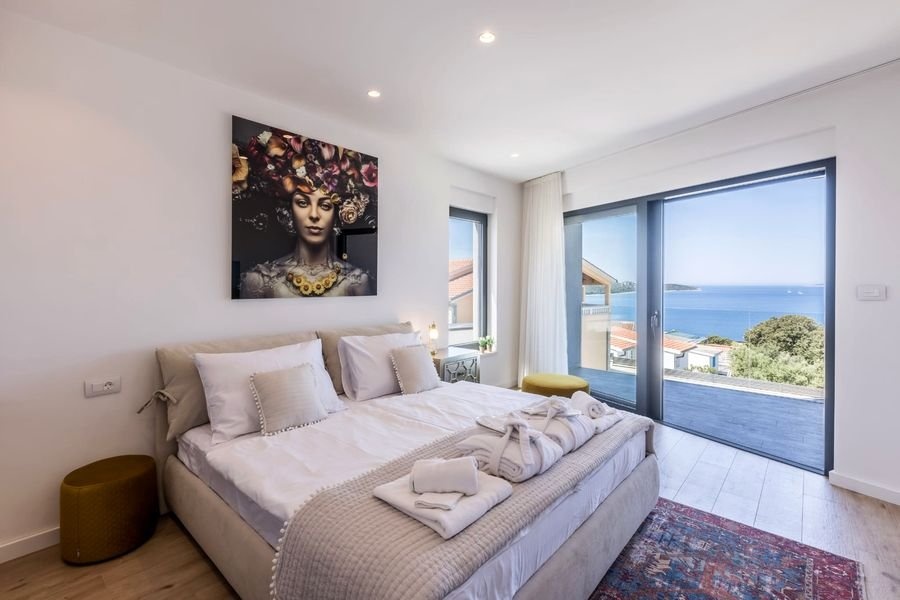 V prvním patře jsou tři ložnice, každá s vlastní koupelnou, které zajišťují soukromí a komfort pro rodinu či hosty. Vila je navržena tak, aby většina místností nabízela nerušený výhled na moře, což umocňuje pocit prostornosti a propojení s okolní krajinou.