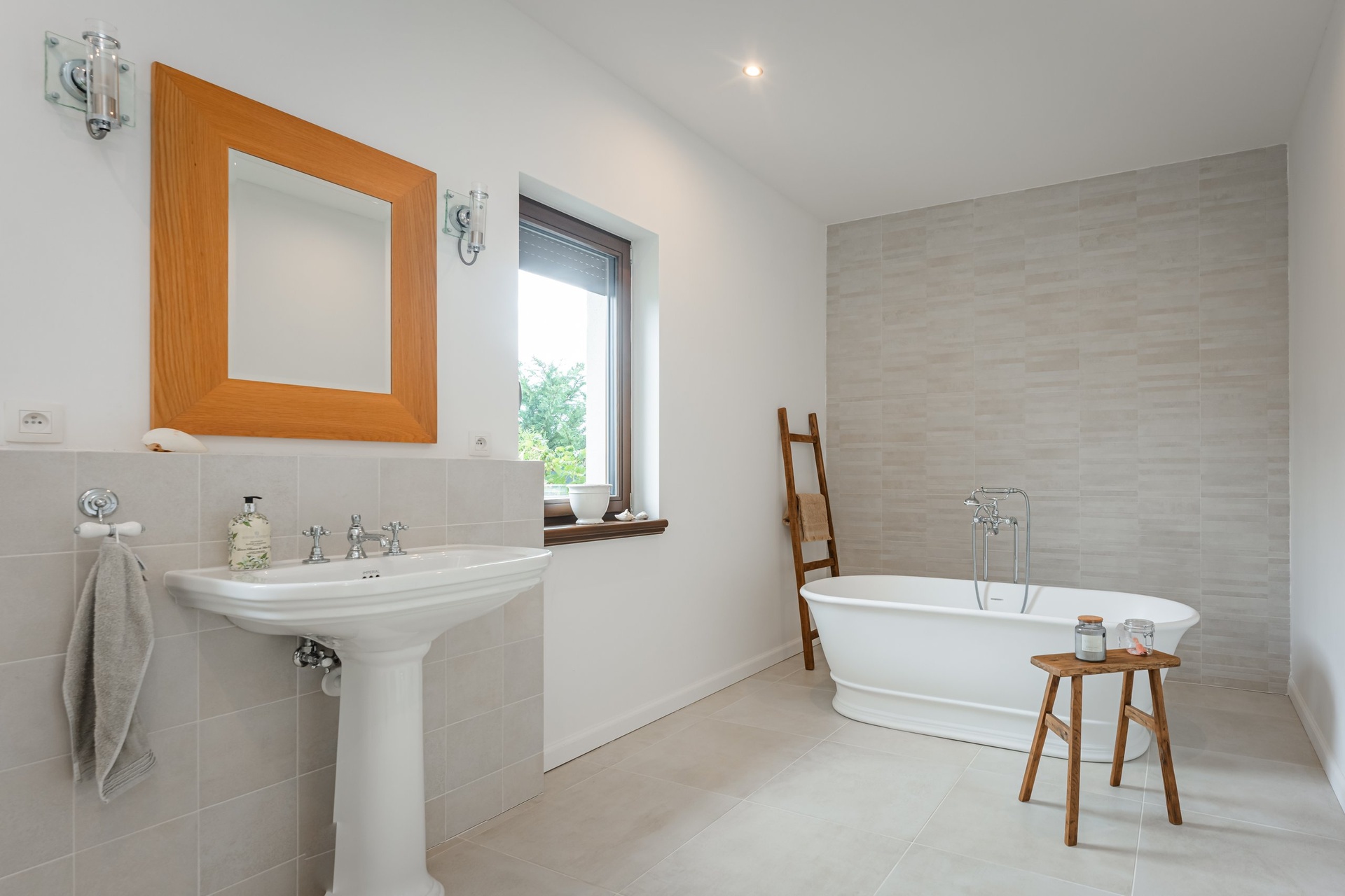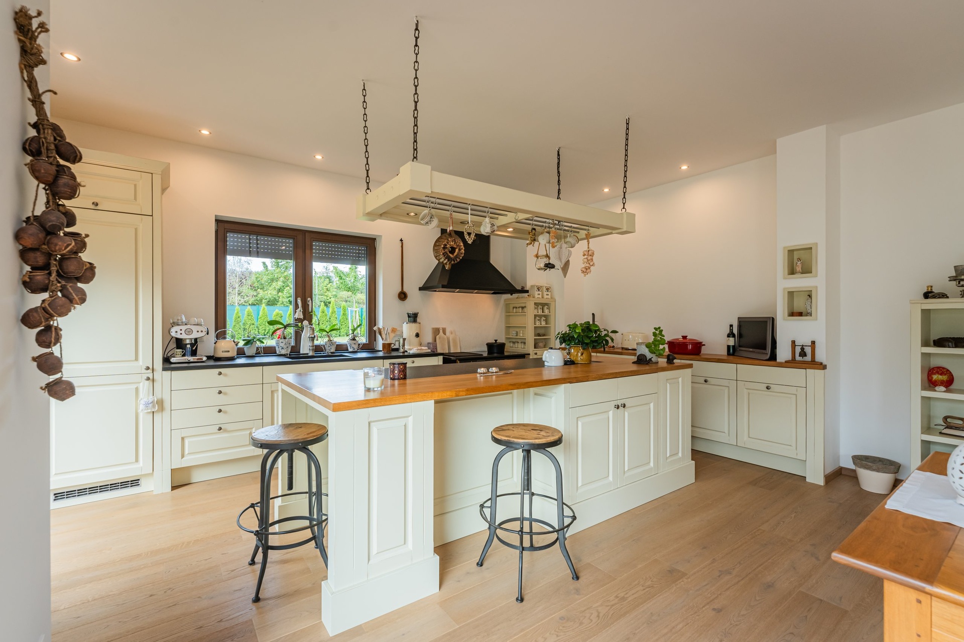 Podlahy v domě jsou keramické a dřevěné (dub). Dveře jsou dřevěné se špaletovými obložkami. Kuchyňská linka je vyrobena z masivu, deska je kombinací černé štípané žuly a masivu. Kuchyňské spotřebiče značky Miele doplňují francouzská kamna Godin s digestoří stejného výrobce. V obývacím prostoru je zabudován příjemný krb s vložkou. Koupelny jsou osazeny luxusní sanitární keramikou od anglického výrobce Imperial Bathroom.