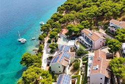 Nabízíme k prodeji apartmánový dům který rozkládá na dvou podlažích, přičemž každé z nich nabízí dva samostatné apartmány. Současná dispozice je ideální pro turistický provoz, ale s minimálními úpravami je možné objekt přetvořit i na komfortní rodinnou vilu – například s denními prostory v přízemí a ložnicemi v patře. Hlavní terasa o rozloze 85 m2 nabízí ničím nerušený výhled na moře a zátoku. Před domem se nachází rozsáhlá zahrada o velikosti 180 m2, která zajišťuje soukromí a navazuje na okolní přírodní prostředí.