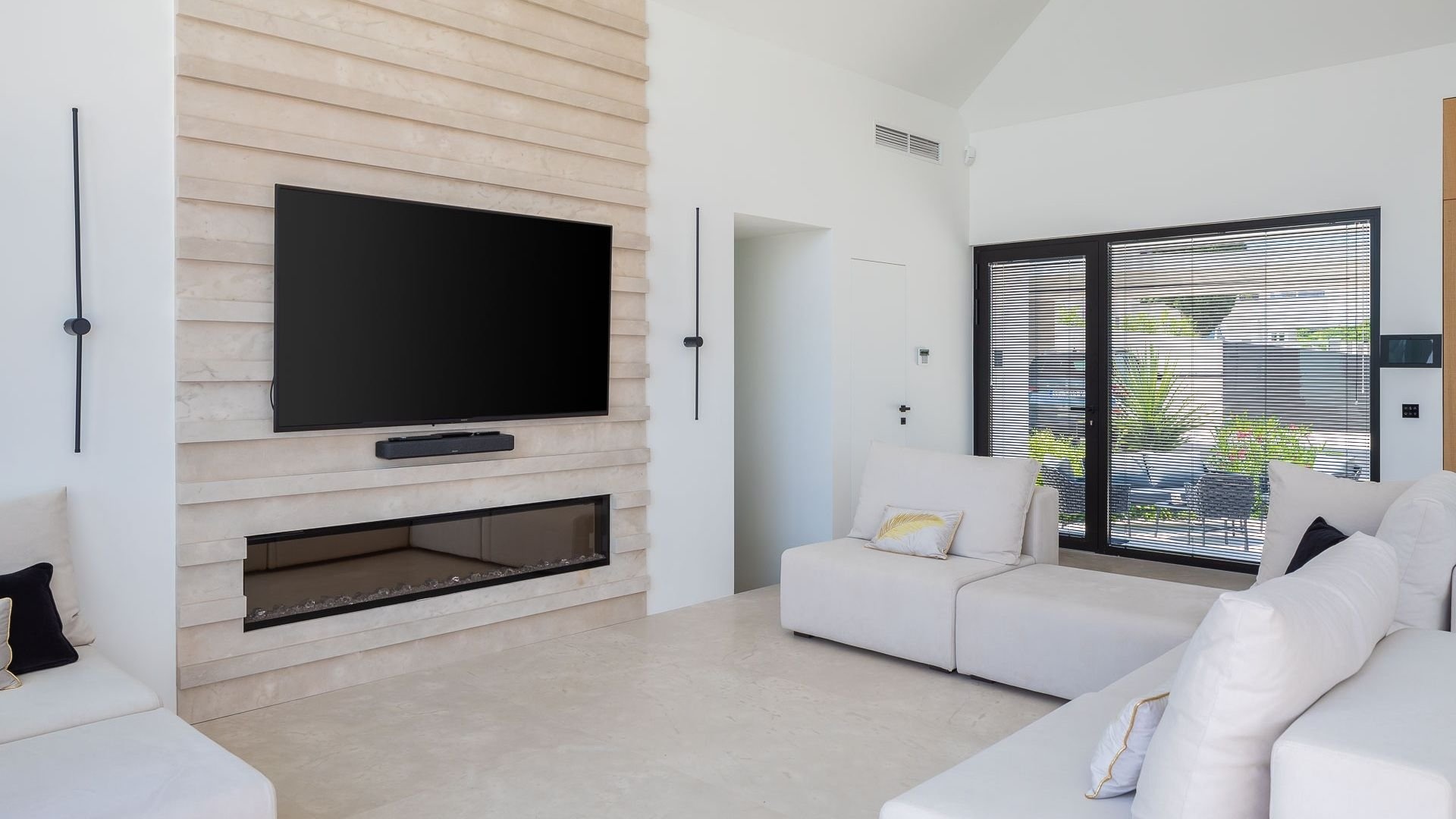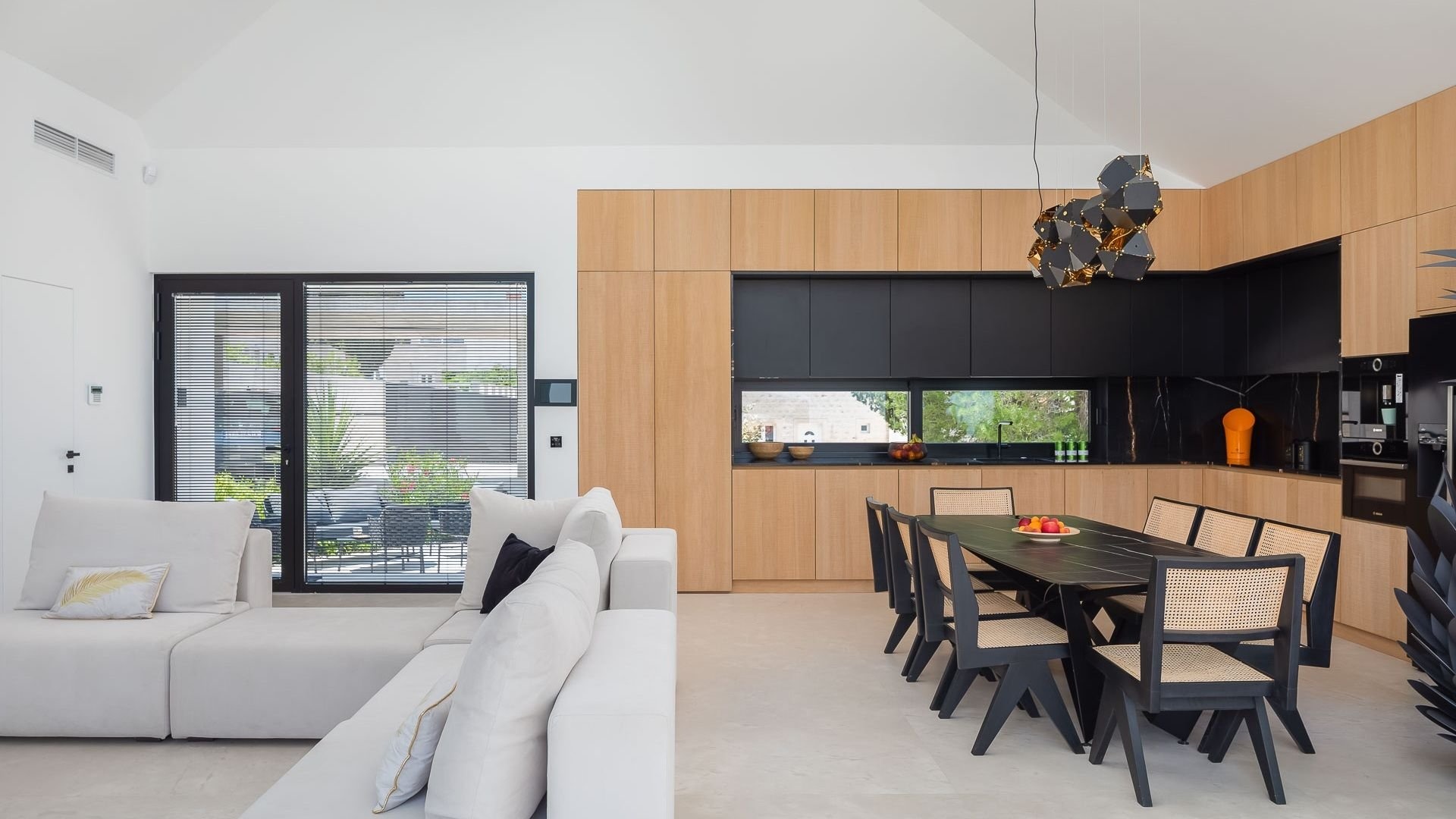 Velké posuvné skleněné stěny propouštějí dostatek denního světla a vizuálně propojují interiér s venkovní částí domu. Přímý vstup na terasu s bazénem a vířivkou vytváří přirozené spojení mezi vnitřním a venkovním životem a umožňuje maximální využití středomořského klimatu.