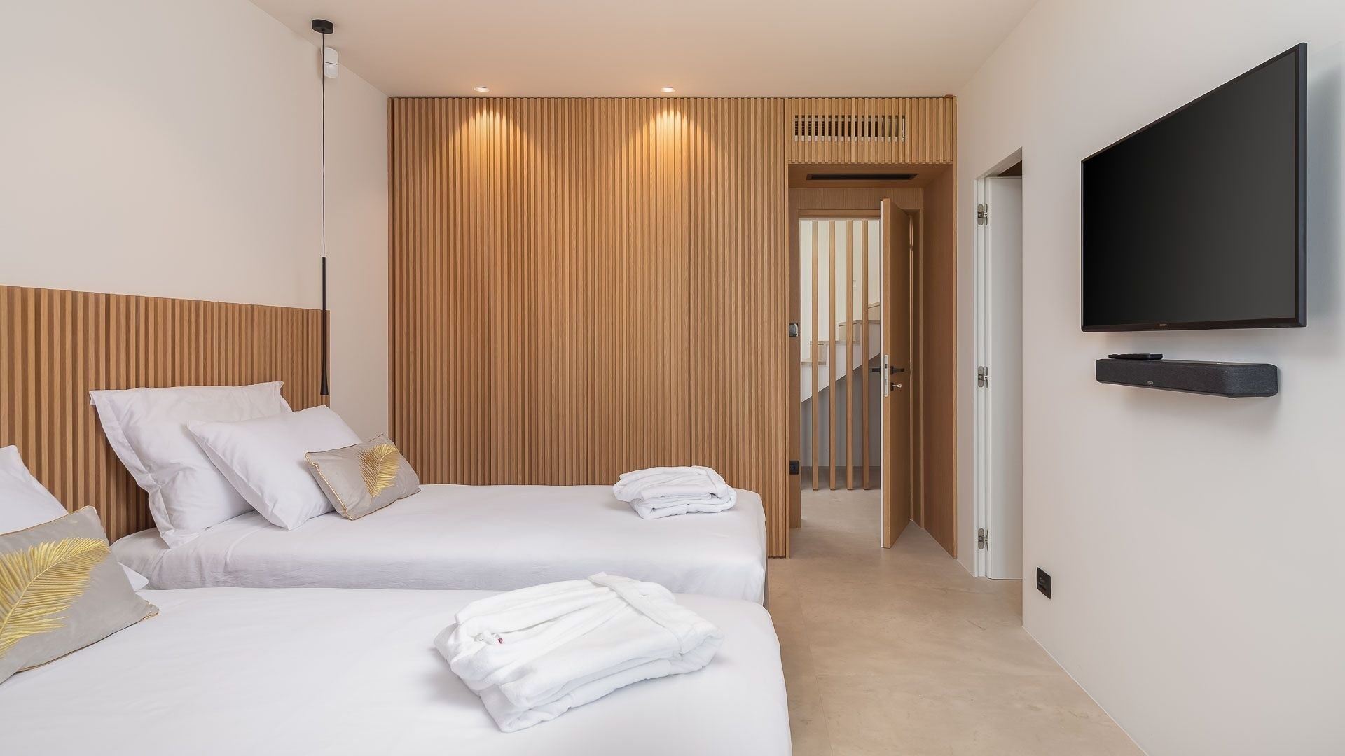 Tato moderní vila s celkovou hrubou plochou 250 m² je rozložena do dvou podlaží a nabízí špičkový komfort i atraktivní architekturu. V prvním patře se nacházejí čtyři prostorné ložnice, každá s vlastním sociálním zařízením, a navíc wellness místnost pro maximální relaxaci. Vnitřní schodiště vede do horního patra, kde se rozprostírá velkorysý otevřený prostor určený pro kuchyň, jídelnu a obývací pokoj – navržený s důrazem na plynulost, funkčnost a estetiku.