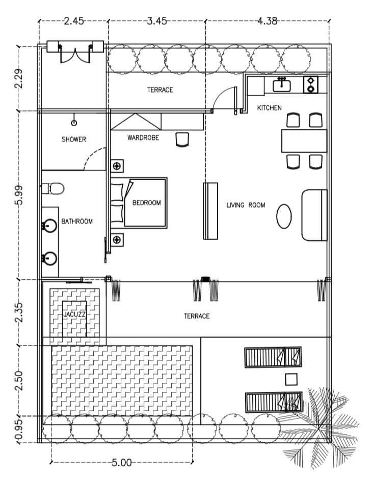 Vila disponuje prostorným obývacím pokojem s moderní kuchyní, soukromou terasou a vlastním bazénem. Interiér je proveden v nadstandardních materiálech a elegantním designu, který citlivě kombinuje moderní luxus s prvky indonéské tradice. Součástí zázemí jsou také prémiové úklidové služby a pravidelná údržba, zajišťující bezstarostné užívání nemovitosti.