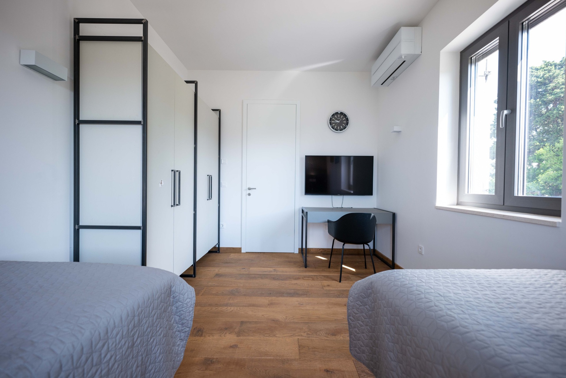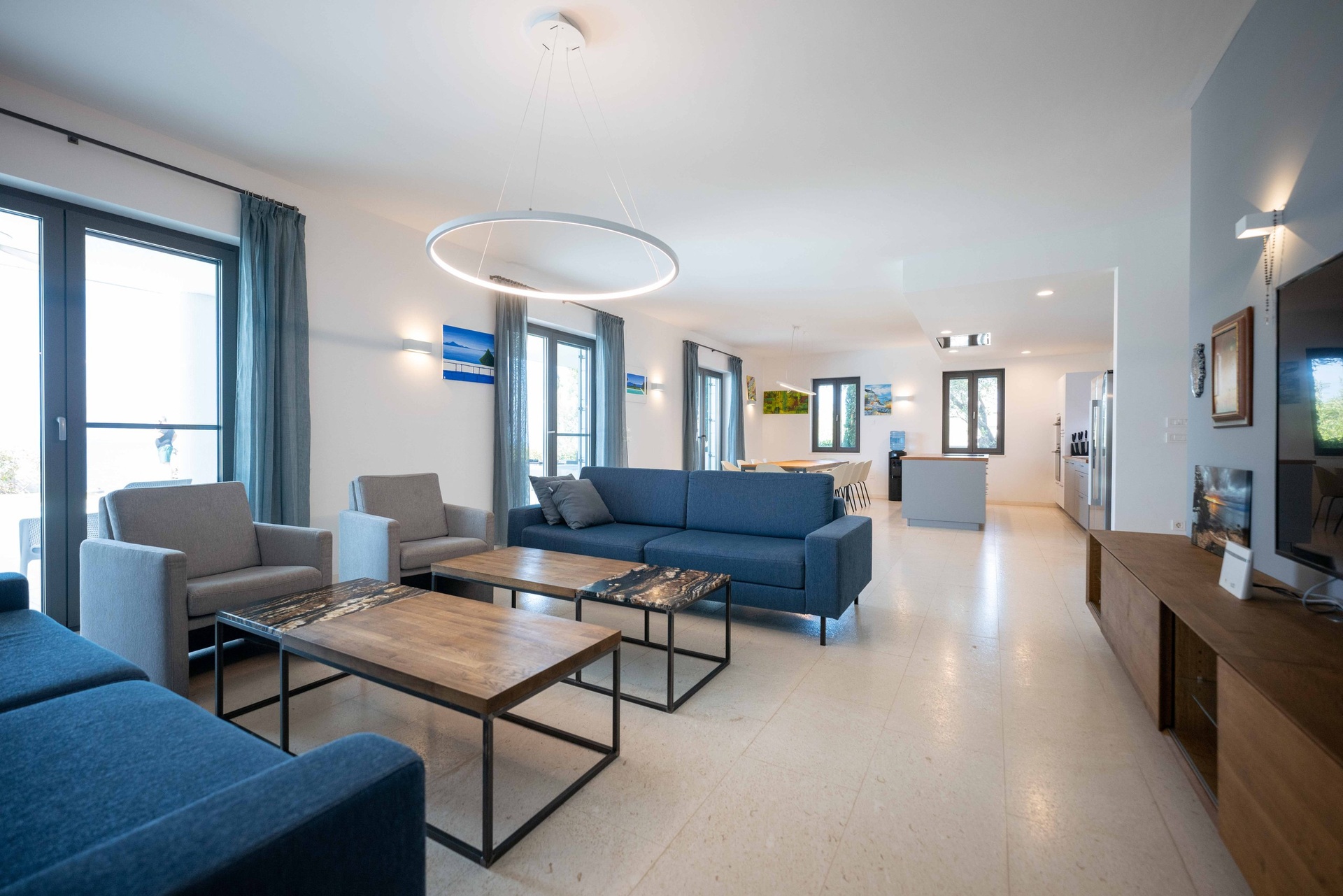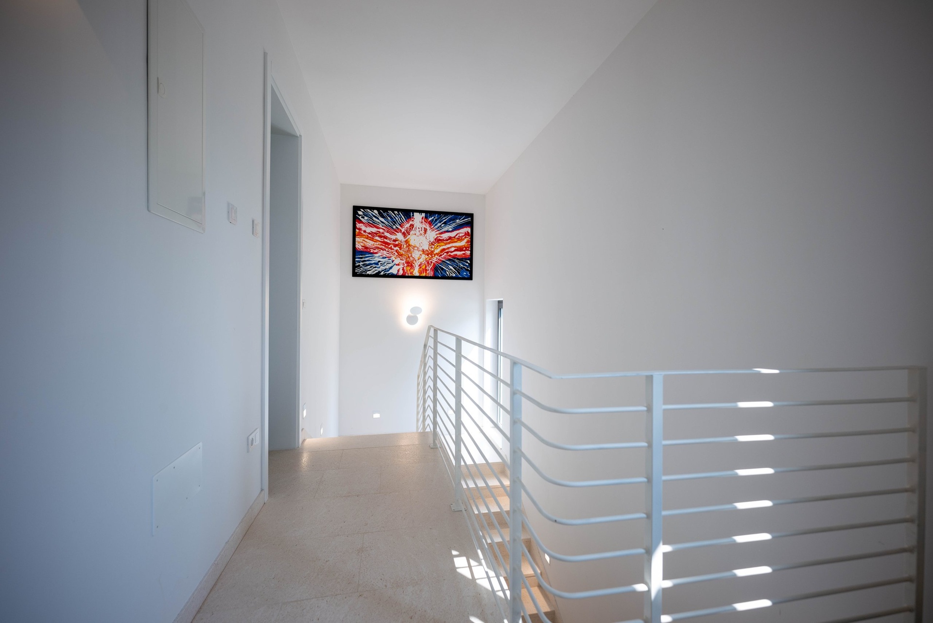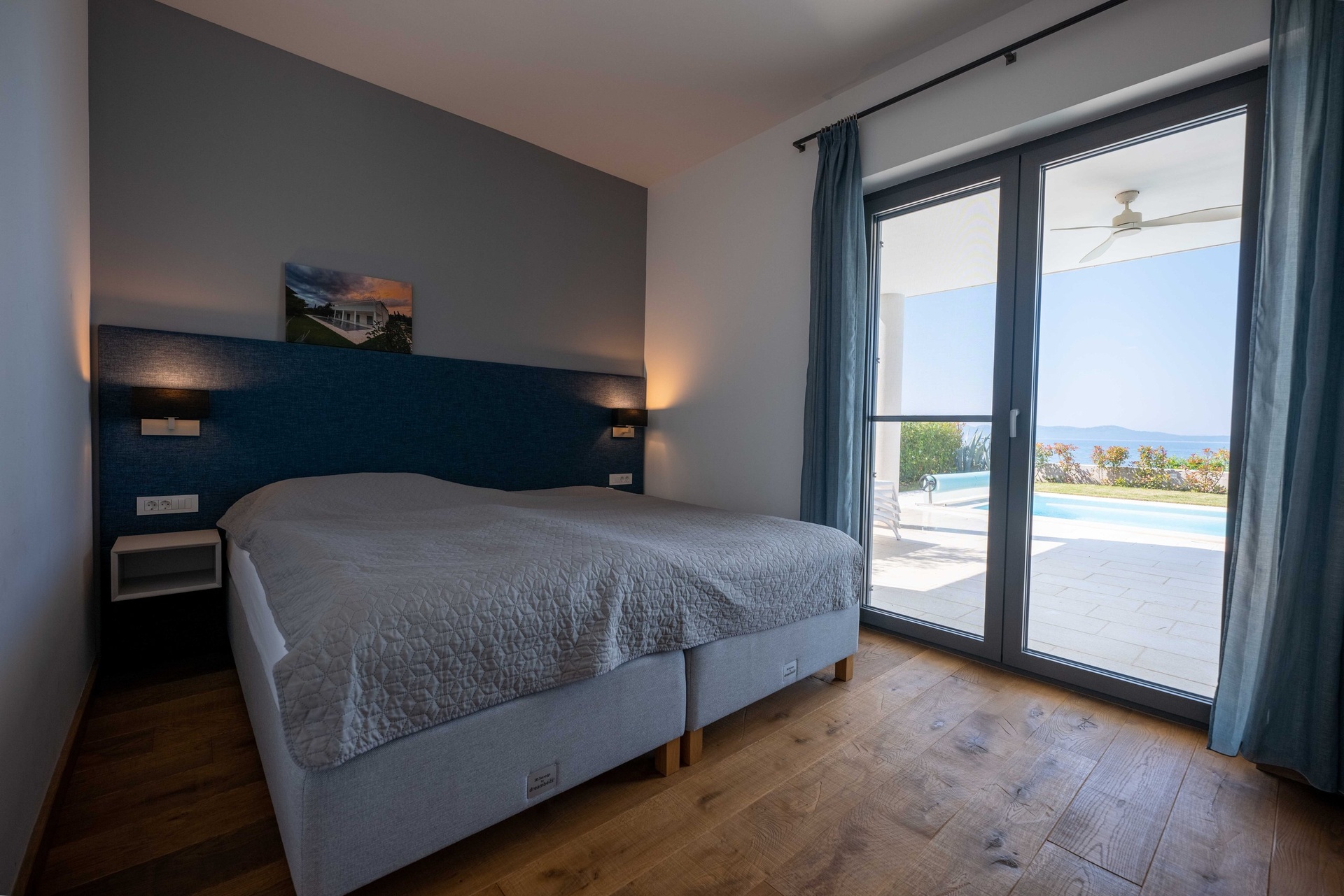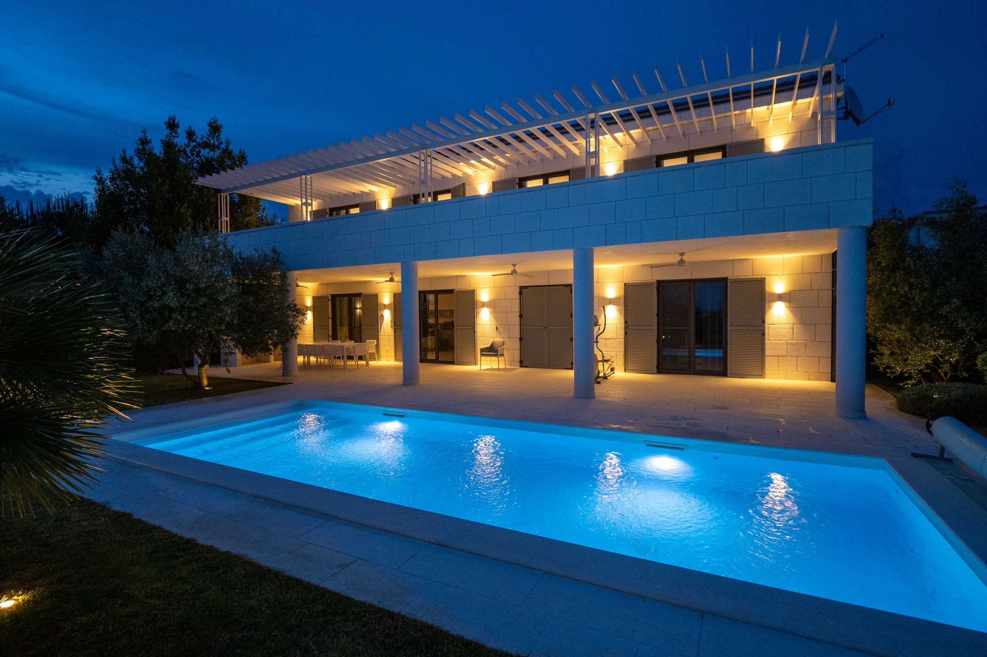Interiér je promyšlen do posledního detailu a díky vysokým stropům a velkoformátovým oknům působí mimořádně vzdušně a svěže. V přízemí se nachází prostorný obývací pokoj propojený s kuchyní a jídelnou, dvě ložnice s koupelnou a technické zázemí. Skleněné dveře vedou přímo na dvůr s bazénem, venkovní sprchou a toaletou. Venkovní plochy jsou obloženy luxusním bračským kamenem, který podtrhuje středomořský charakter nemovitosti. V patře se nacházejí tři ložnice, každá s vlastní koupelnou či šatnou, a také pracovna, kterou lze snadno přizpůsobit dle potřeb. Z velkého balkonu se otevírá působivý panoramatický výhled na moře a okolní ostrovy.