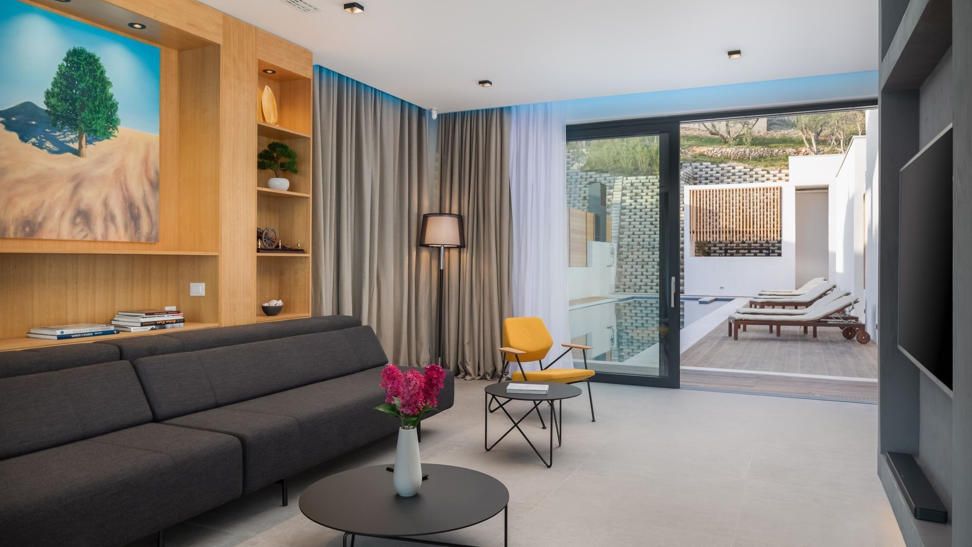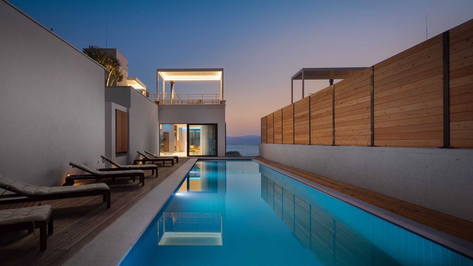 O patro výše se rozprostírá prostorná kuchyně s jídelnou, navržená z nejkvalitnějších materiálů s důrazem na funkčnost a design. Jižní stěna je celoprosklená a otevírá působivý výhled na moře, zatímco severní část obývacího pokoje plynule přechází do venkovního prostoru s terasou, bazénem, venkovní sprchou a slunečními lehátky. Součástí této úrovně jsou i tři ložnice, každá s vlastní koupelnou a soukromou terasou.
