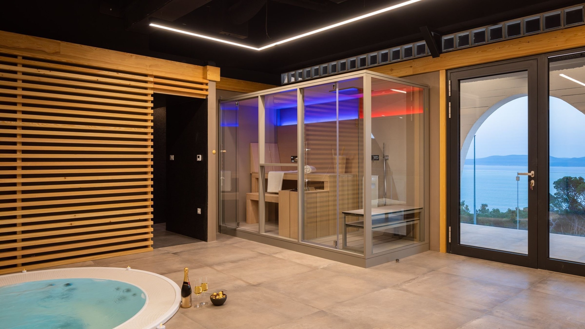 V prvním nadzemním podlaží je promyšlená wellness zóna, která zahrnuje vstupní halu, posilovnu, saunu, tropickou sprchu, hydromasážní vířivku a relaxační místnost. Velká terasa s výhledem na moře dodává celému prostoru výjimečnou atmosféru.