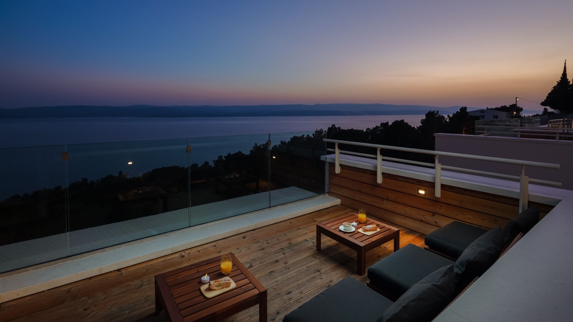 Je zde taky střešní terasa s plně vybavenou letní kuchyni s plynovým grilem, kamenným dřezem, výrobníkem ledu a miniledničkou, doplněná o jídelní kout, prostor pro společenské posezení a relaxační zónu s výhledem na Jaderské moře a okolní ostrovy Brač, Hvar a Korčula.