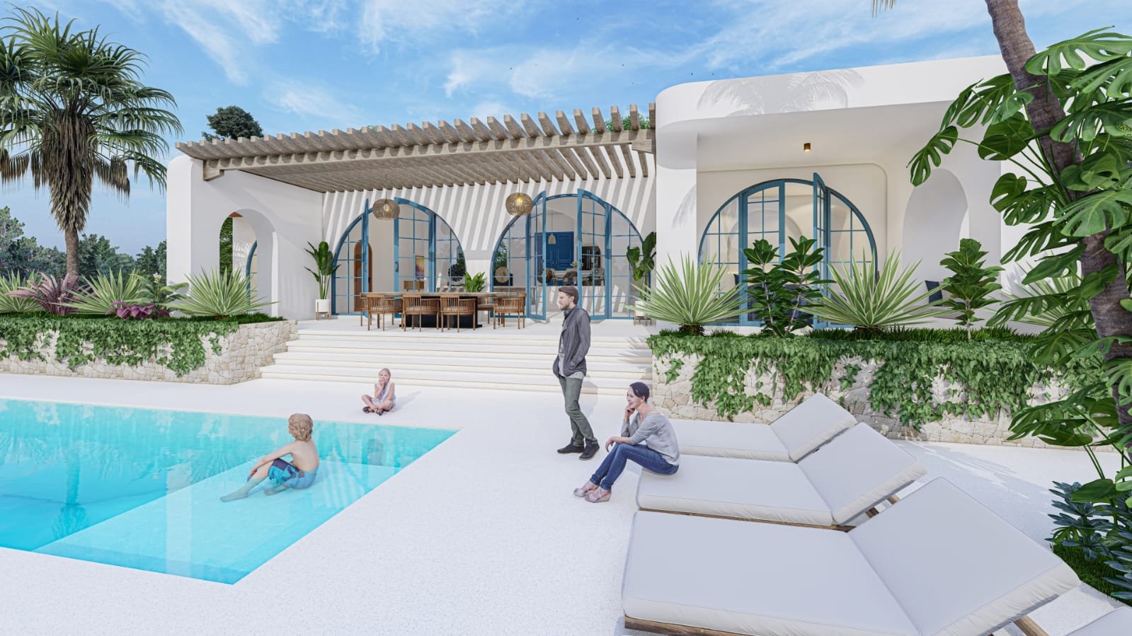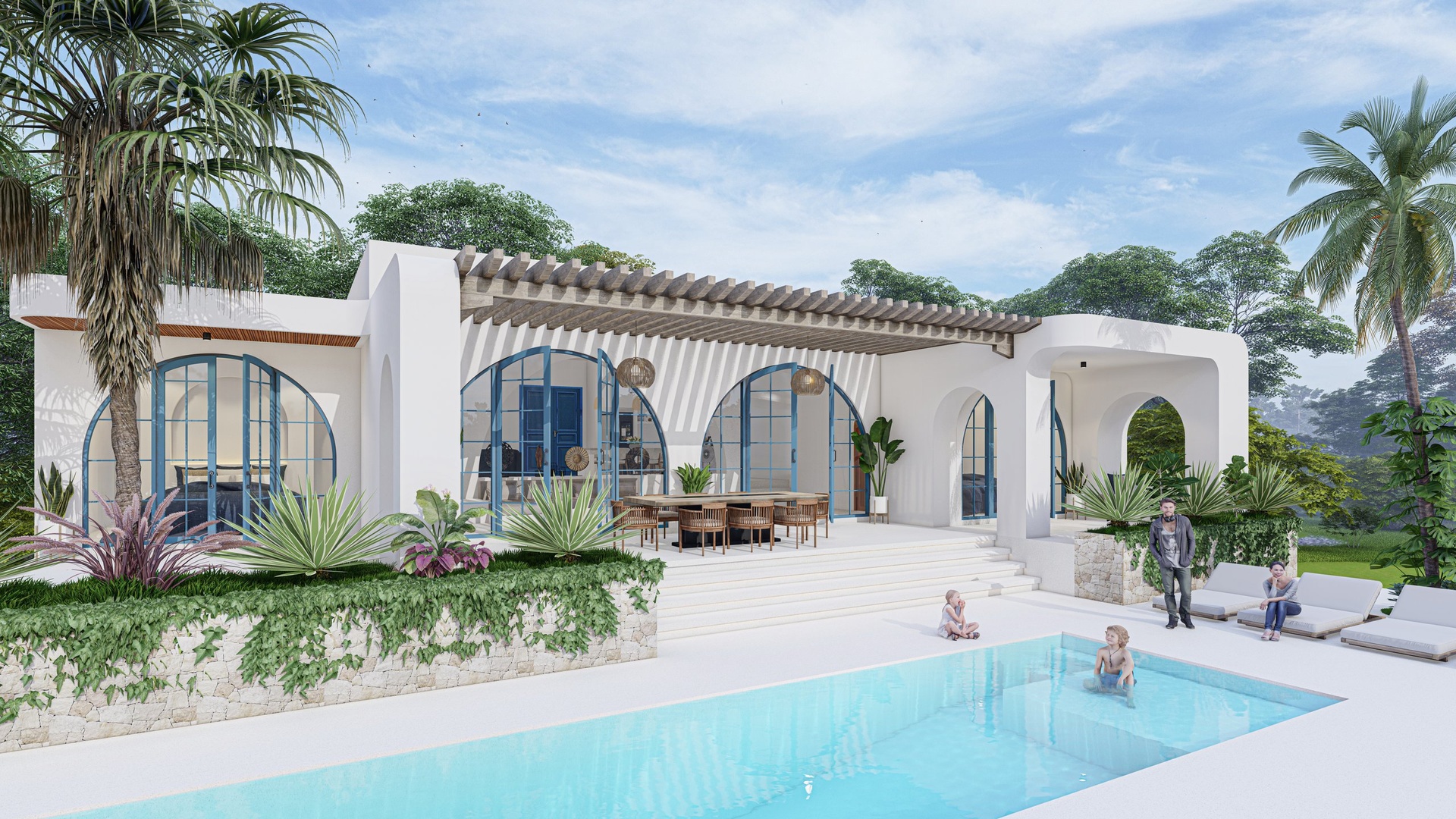 Vila o celkové podlahové ploše 152 m² na pozemku 800 m² disponuje prostorným obývacím pokojem s kuchyňským koutem, dvěma ložnicemi, lodžií a prostornou terasou s velkým soukromým bazénem.