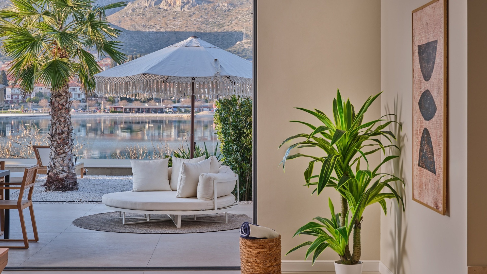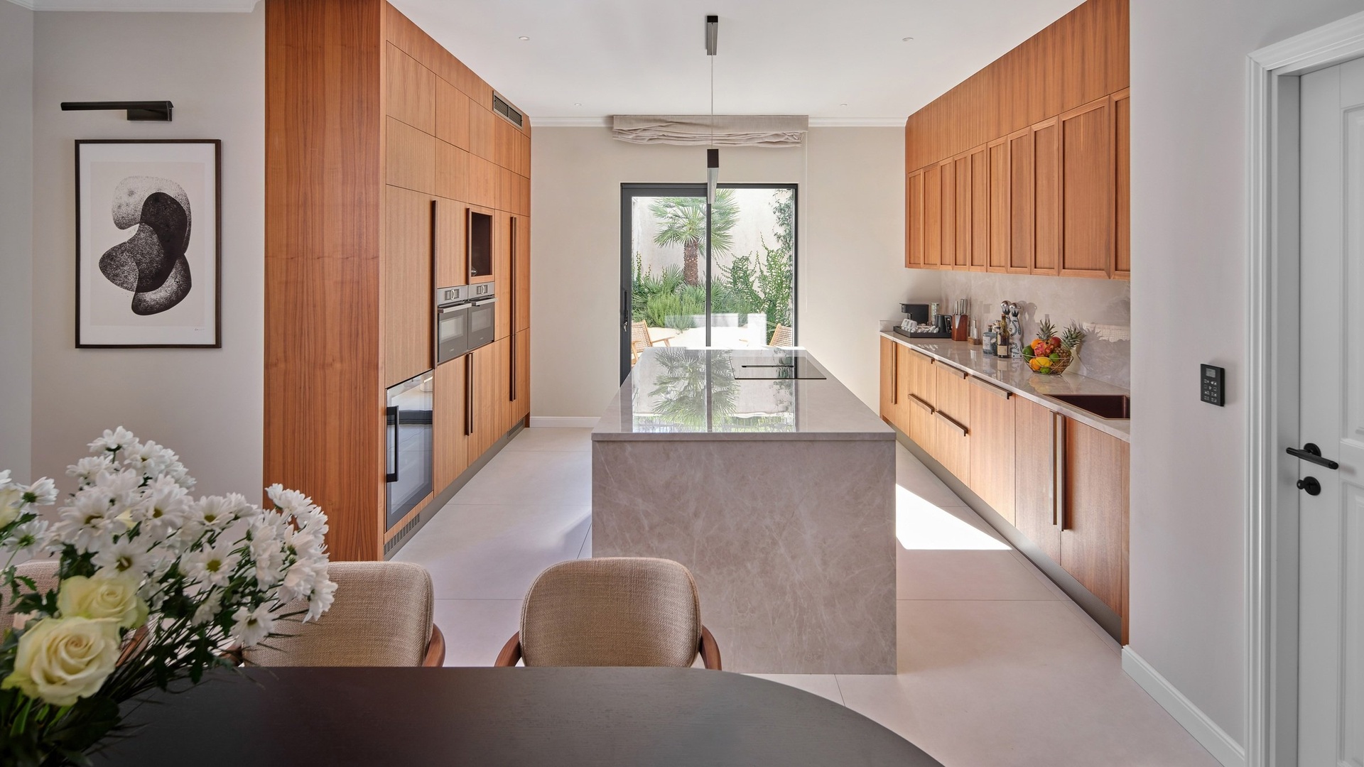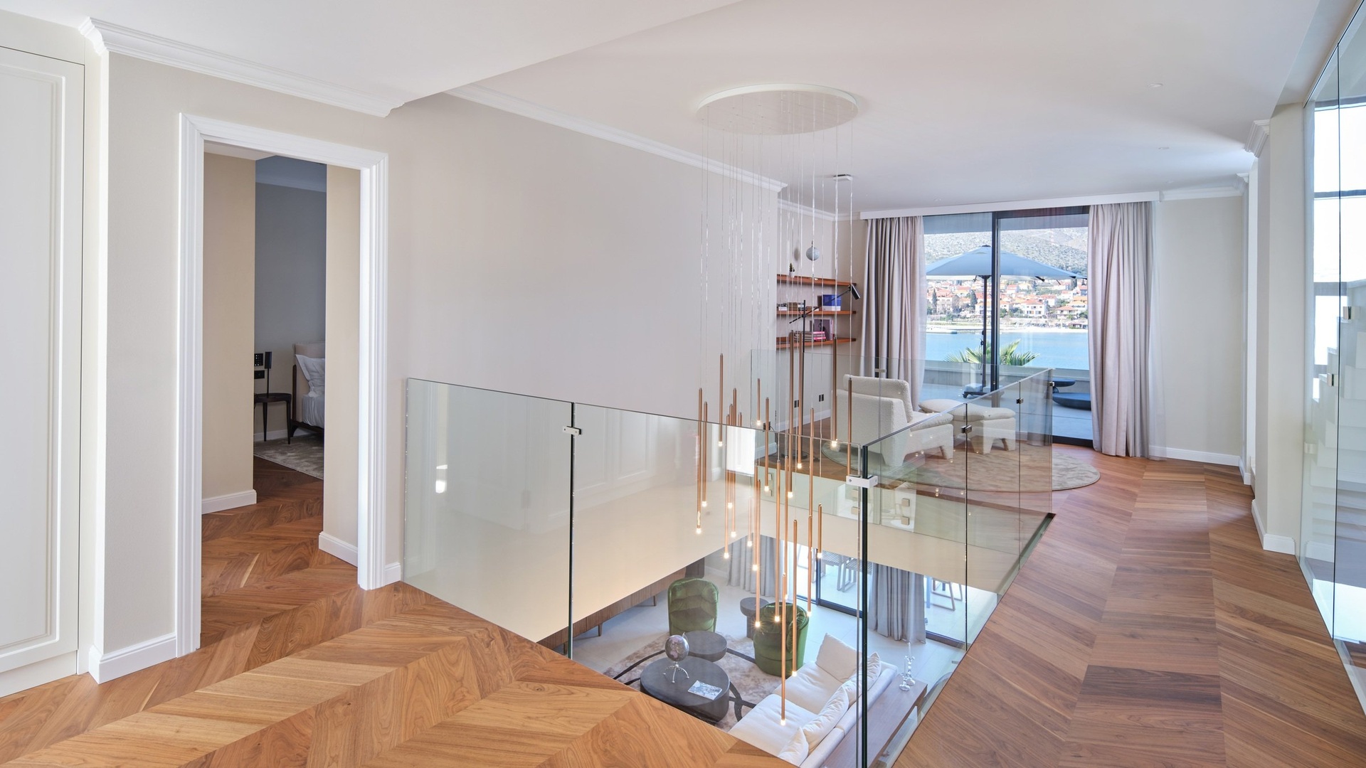 Vila je rozložena do tří moderních a precizně vybavených podlaží. Hlavní obytné patro nabízí ložnici, koupelnu, plně vybavenou kuchyň s jídelnou a prostorný obývací pokoj se vstupem na velkorysou terasu s vyhřívaným přelivovým bazénem, venkovním posezením a navazující soukromou zahradou osázenou středomořskou vegetací.