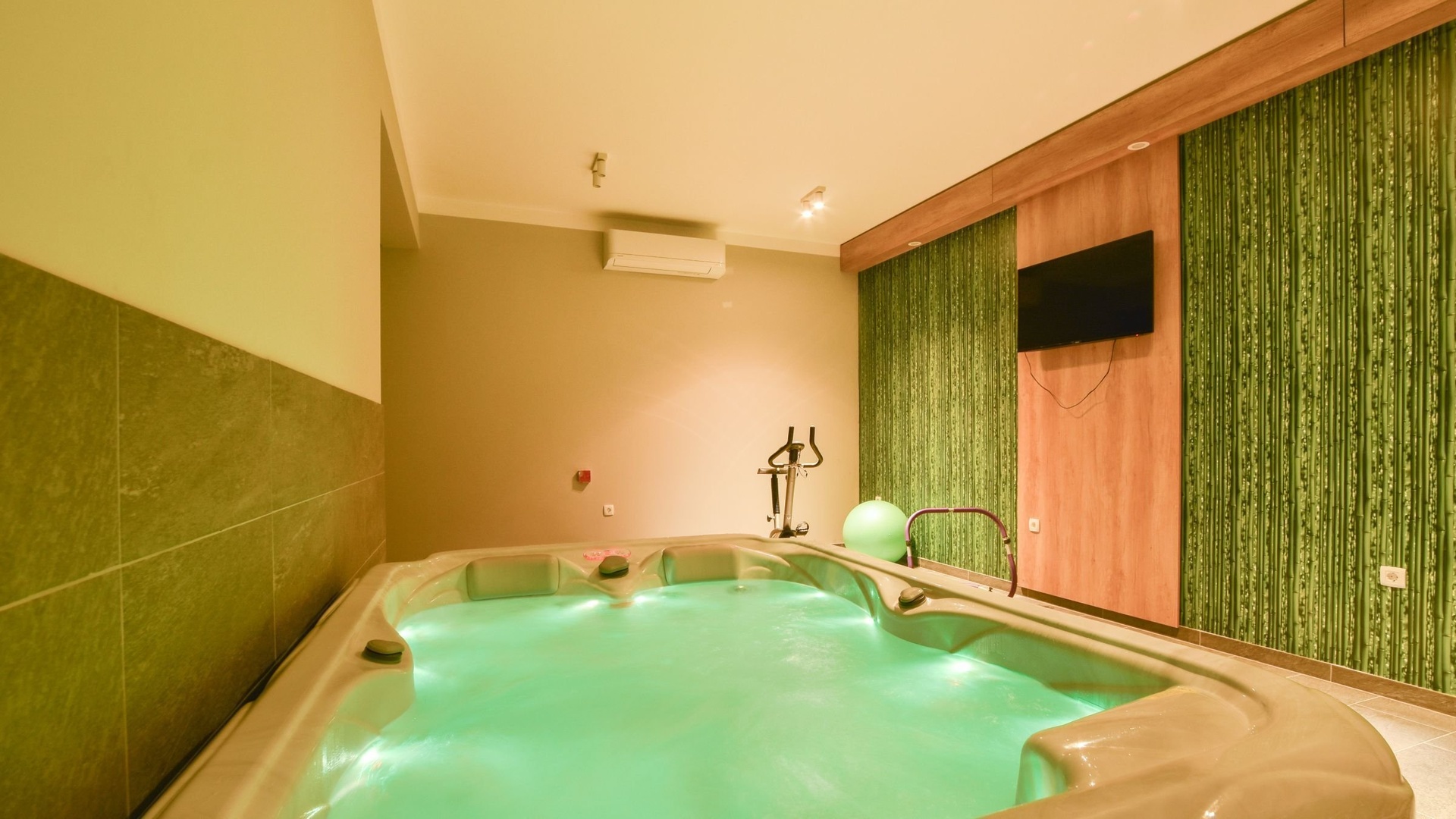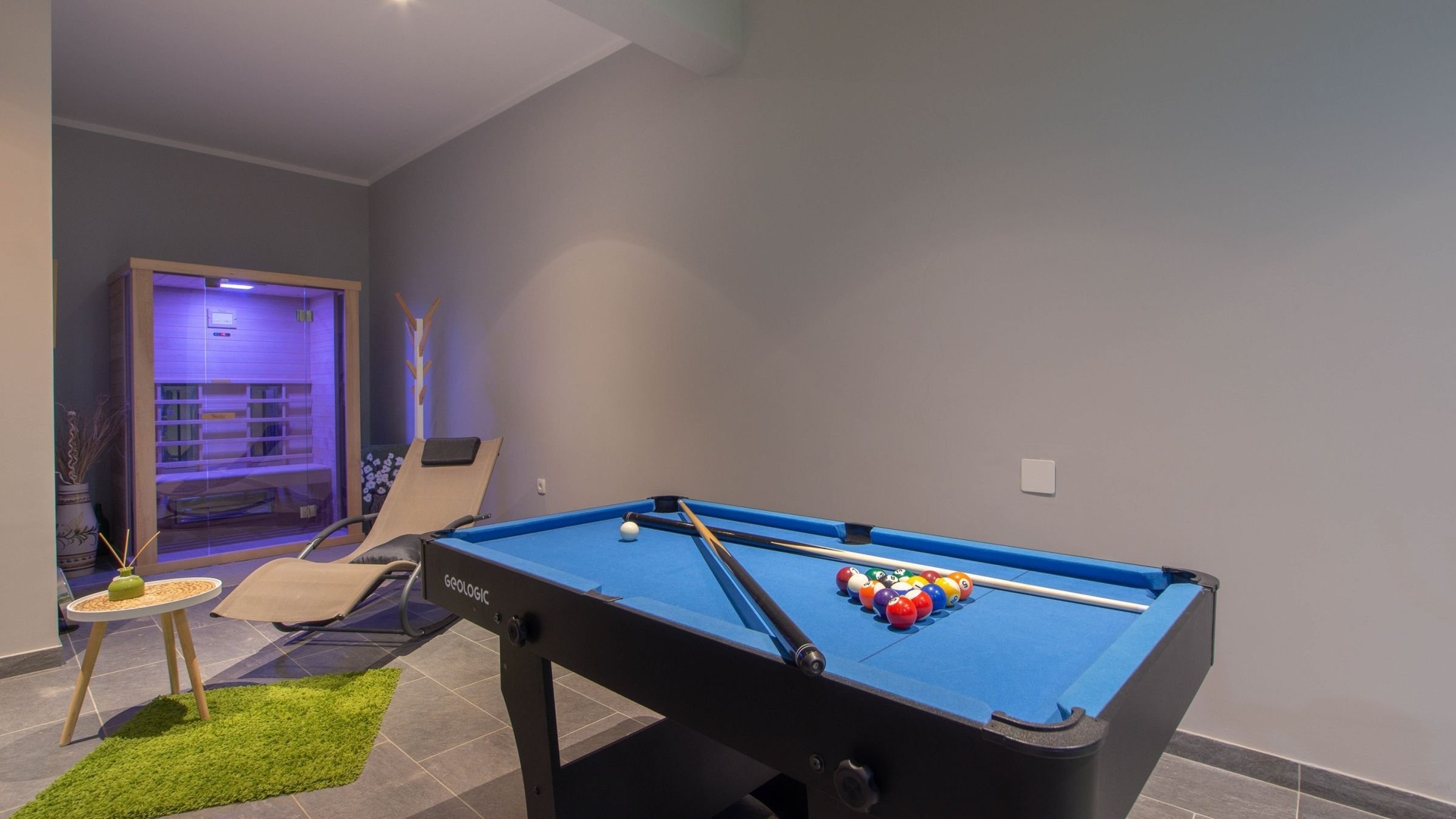 V přízemí vily se nachází wellness zóna se saunou, vířivkou a přímým vstupem k velkému vyhřívanému bazénu o rozloze 33 m², který je obklopen prostornou sluneční terasou a zelení. Druhé podlaží nabízí komfortní ložnici s vlastní koupelnou, plně vybavenou kuchyň s jídelním koutem a prostorný obývací pokoj. Z něj se francouzskými okny vstupuje na venkovní terasu, odkud se otevírá úchvatný panoramatický výhled na moře a okolní přírodu. Třetí podlaží je navrženo jako klidová zóna se čtyřmi samostatnými ložnicemi, každá s vlastní koupelnou, což zajišťuje absolutní pohodlí pro větší rodinu nebo skupinu hostů.