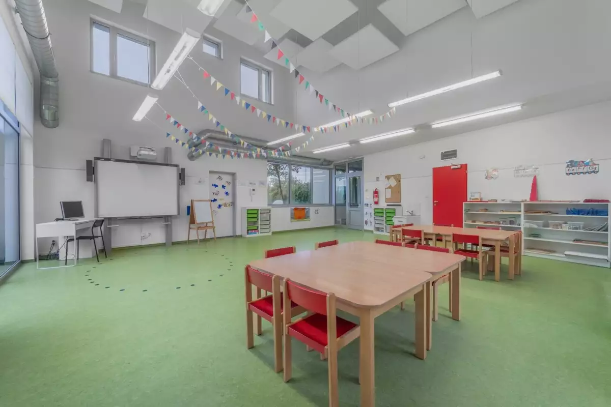 Interiér školky je pečlivě navržen pro potřeby malých dětí i personálu – v přízemí jsou vybudované dvě prostorné třídy (63 m² a 45 m²), navazující zázemí v podobě dětské umývárny, toalet, šaten, přípravny pokrmů, skladů a prostor pro zaměstnance. Celý provoz propojuje centrální vstupní hala, která vytváří přirozený komunikační uzel.