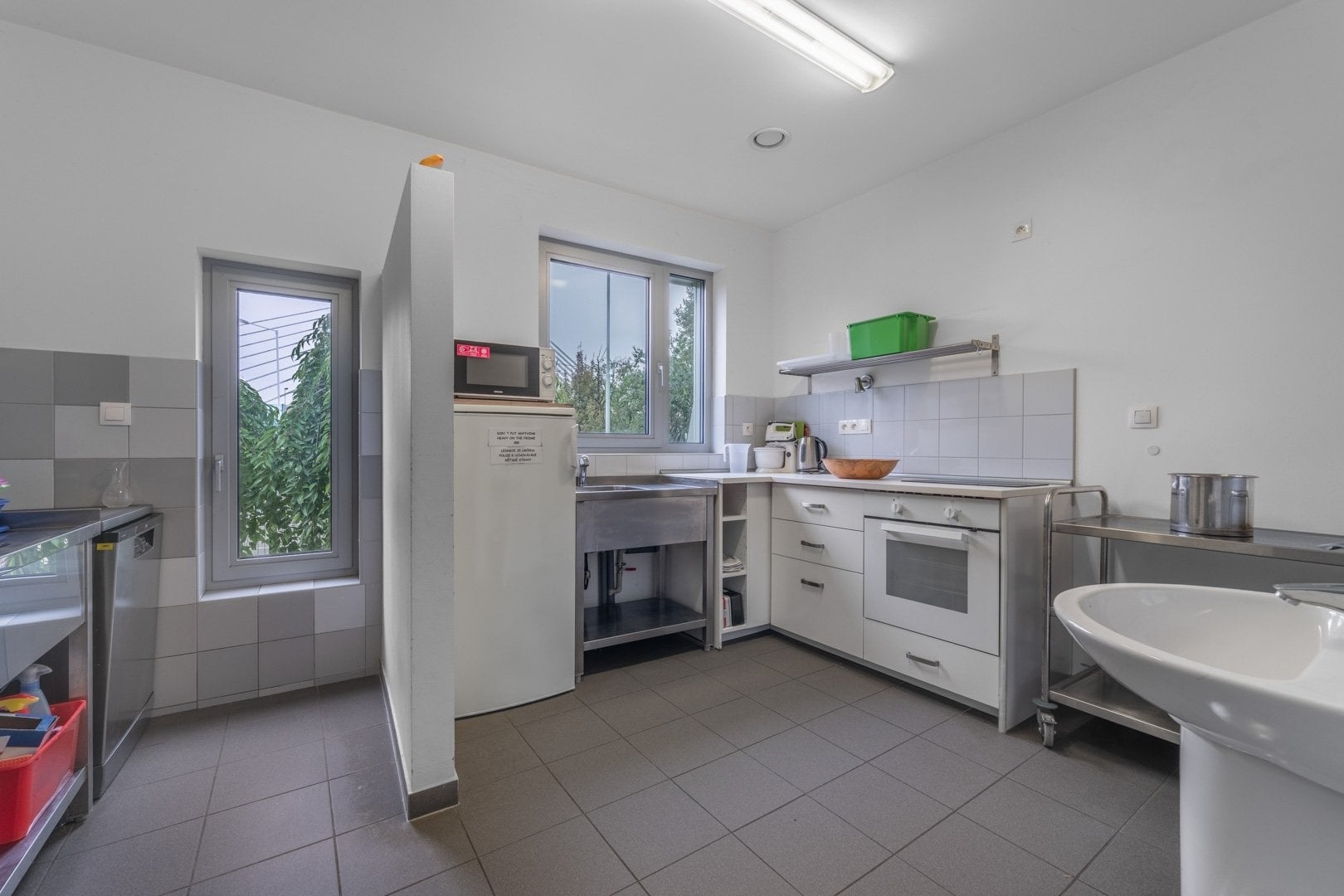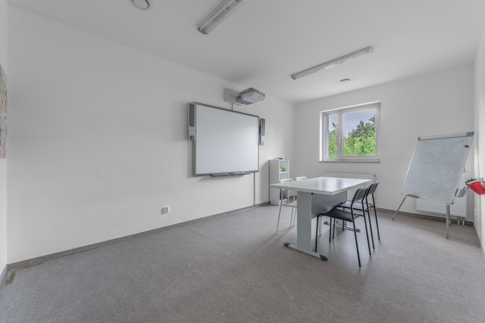 První nadzemní podlaží je přístupné samostatným vstupem ze zahrady, což umožňuje oddělené fungování jednotlivých částí objektu. Tato část obsahuje další dvě učebny s příslušenstvím a také samostatnou bytovou jednotku 2+kk o výměře 49 m². Ta může sloužit jako služební byt, kanceláře nebo zázemí pro další aktivity. Budova je situována uprostřed oploceného pozemku a ze všech stran ji obklopuje pečlivě upravená zahrada. Ta byla navržena s důrazem na bezpečnost i herní potřeby venkovních aktivit. Vzrostlá zeleň a uspořádání zahrady vytvářejí příjemné mikroklima a přirozený prostor pro dětské hry i odpočinek. K nemovitosti náleží tři parkovací místa.