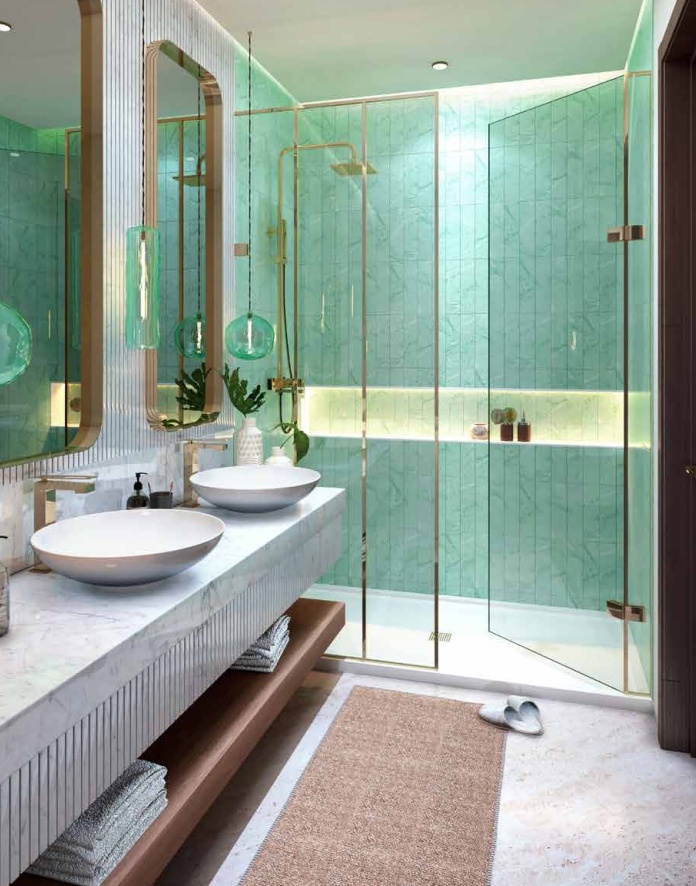 Interiéry bytů jsou navrženy s důrazem na jednoduchost a eleganci. Plně vybavená kuchyně je doplněna zařízenými koupelnami, což vytváří jedinečný zážitek z bydlení.