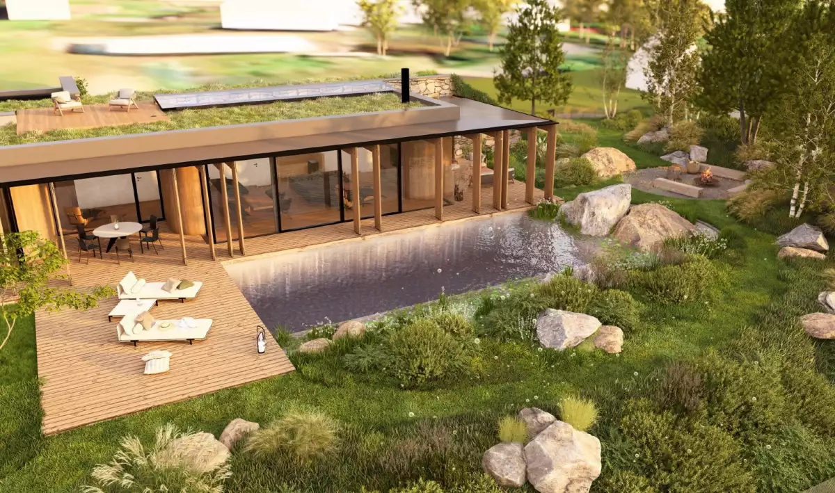 Součástí nabídky je schválený projekt pro solitérní rodinný dům určený k trvalému bydlení. Architektonické řešení reflektuje nejnovější trendy – dům je navržen jako jednopodlažní objekt s pochozí zelenou střechou a dispozicí 4+kk o celkové ploše 435 m². Součástí je prostorná terasa, sauna, biotop, garáž pro dvě auta a velké kryté parkovací stání.