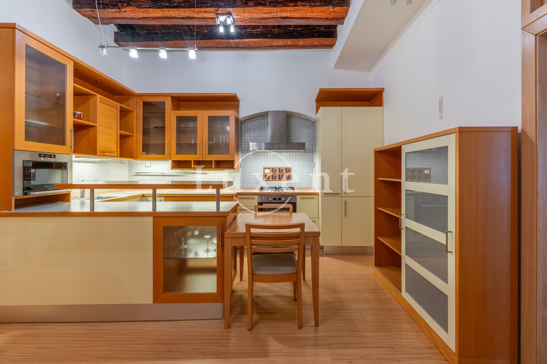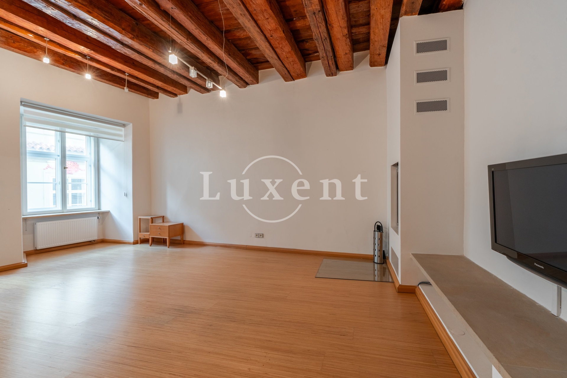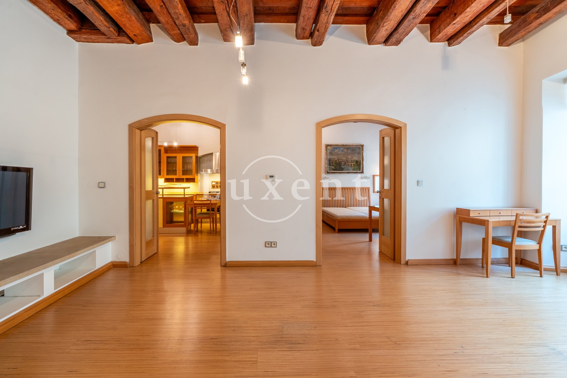 Dispozice zahrnují prostorný obývací pokoj, kuchyň s jídelním stolem, ložnici s manželskou postelí a šatní skříní, koupelnu s vanou a toaletou. Kuchyň je plně vybavena (plynový sporák, digestoř, lednice s mrazákem, myčka, mikrovlnná trouba). Původní dřevěné trámy, krb, úložné prostory, TV, pračka. Historický dům s množstvím originálních prvků. K bytu náleží samostatná sklepní místnost přímo na patře.
