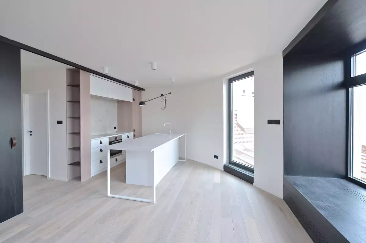 Dispozice nabízí vstupní chodbu, koupelnu, ložnici a prostorný obývací pokoj s kuchyňským koutem vybaveným všemi spotřebiči – indukční varnou deskou, digestoří, horkovzdušnou troubou, myčkou a lednicí s mrazákem. Součástí vybavení je i pračka se sušičkou. Rekonstrukce bytu proběhla ve vysokém standardu a byly zde použity nejkvalitnější materiály. Repasované dřevěné parkety, nová okna s dvouvrstvým sklem. Klimatizace ve všech místnostech.