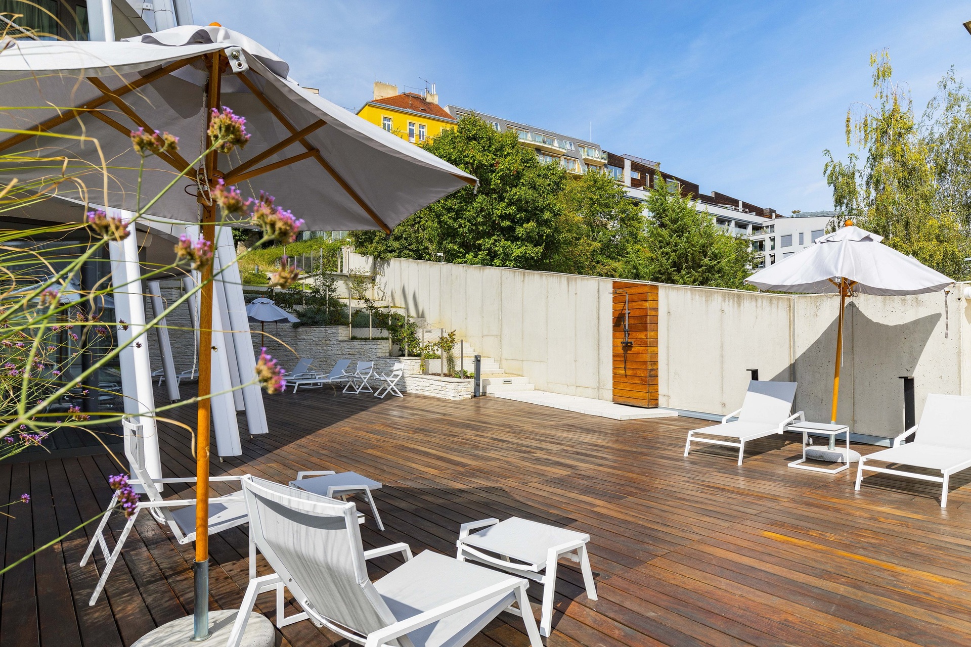 V projektu byly použity vysoce kvalitní materiály. Masivní dřevěné podlahy. V koupelnách velkoformátová dlažba. Podlahové topení v celém bytě. Francouzská okna se zvukovou izolací zajišťující klid a také nadměrné osvětlení. Každá z místností disponuje vlastním vstupem na terasu.