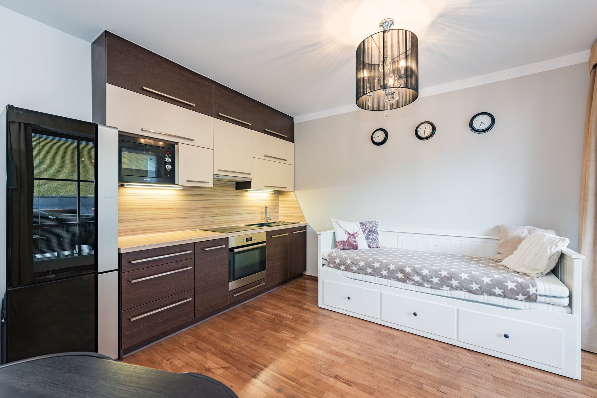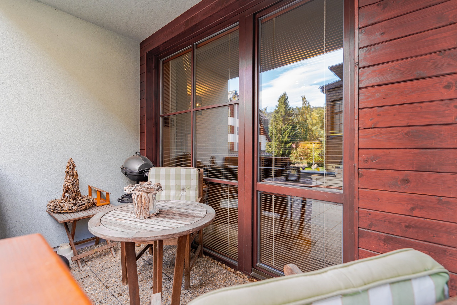 Dispozice zahrnují obývací místnost s rozkládací pohovkou, kuchyňský kout vybavený všemi spotřebiči, ložnici s manželskou postelí, koupelnu s vanou a umyvadlem a oddělenou toaletu. Byt se pronajímá kompletně a nadstandardně vybavený. Vestavěné úložné prostory. Kvalitní postel značky Quantum. Terasa s venkovním posezením a grilem. Součástí koupelny je i pračka a sušička.