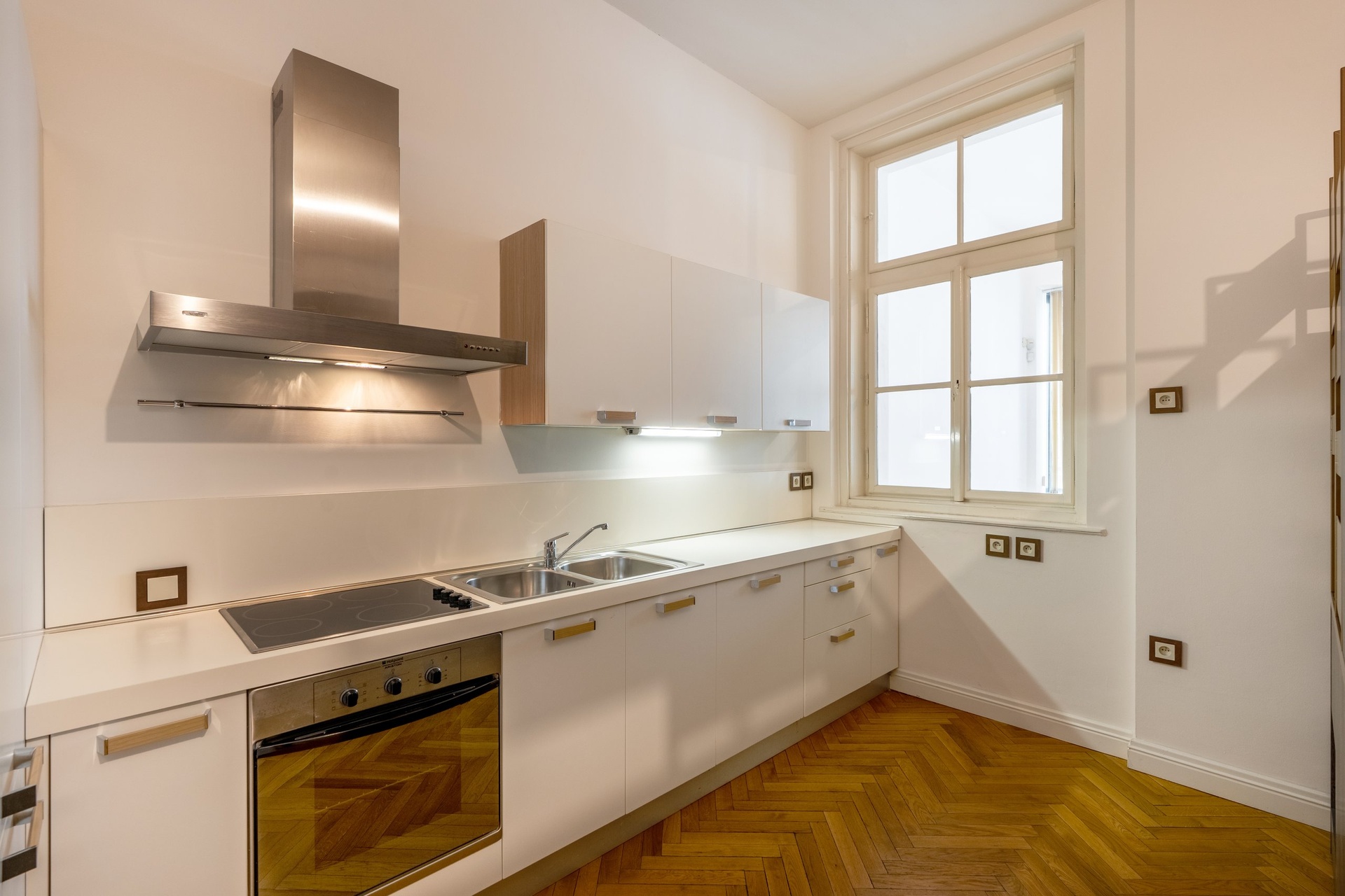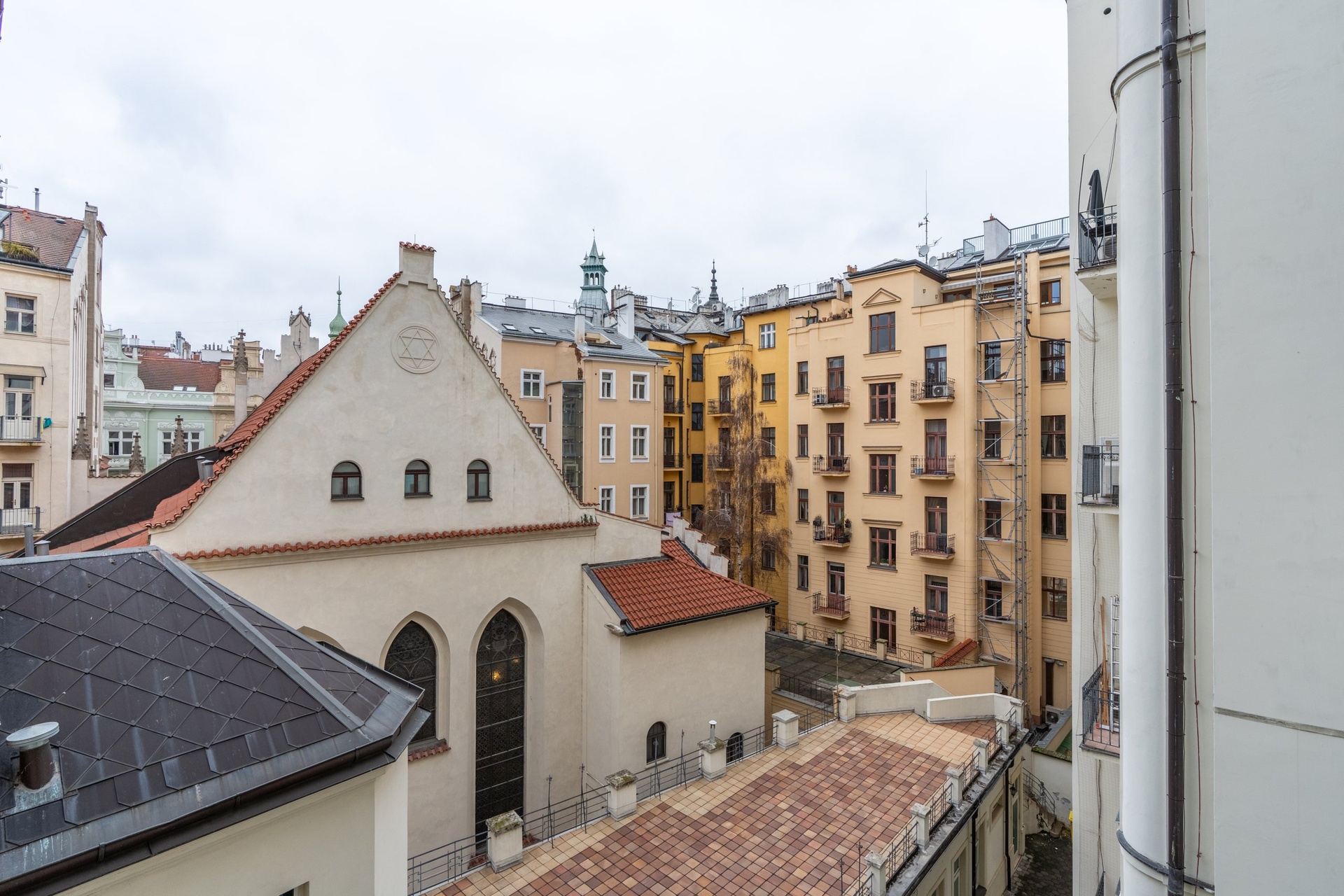 Dispozice zahrnuje prostornou předsíň, tři samostatné pokoje či ložnice, plně vybavenou moderní kuchyni s jídelním koutem, dvě samostatné koupelny a dva menší balkony – jeden s výhledem do ulice Jáchymova a druhý do klidného vnitrobloku. Díky dvěma odděleným koupelnám nabízí byt maximální komfort, soukromí a flexibilitu, což ocení rodiny, páry i ti, kteří občas potřebují oddělené zóny například pro práci nebo hosty. Všechny místnosti jsou prosvětlené velkými okny s výhledy na okolní historickou zástavbu, podlahy tvoří klasické parkety v rybí kosti a v bytě je instalována klimatizace pro celoroční komfort.