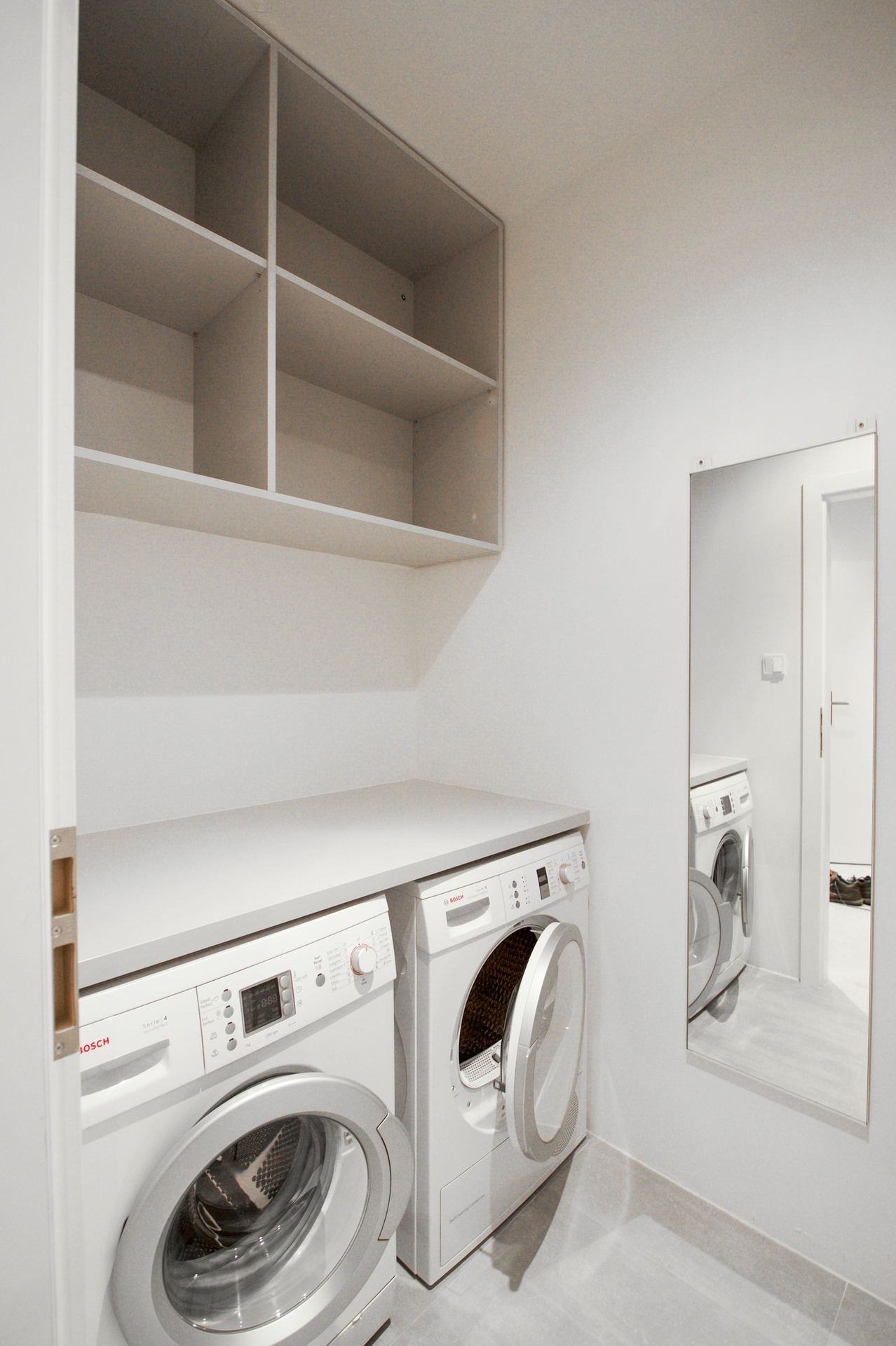 Dispozice nabízí vstupní chodbu, koupelnu se sprchovým koutem, toaletou a bidetem, master ložnici s en suite koupelnou se sprchovým koutem a toaletou, další ložnici a prostorný obývací pokoj s kuchyňským koutem vybaveným všemi spotřebiči – indukční varnou deskou, digestoří, horkovzdušnou troubou, myčkou a lednicí s mrazákem. Součástí vybavení je i pračka se sušičkou.