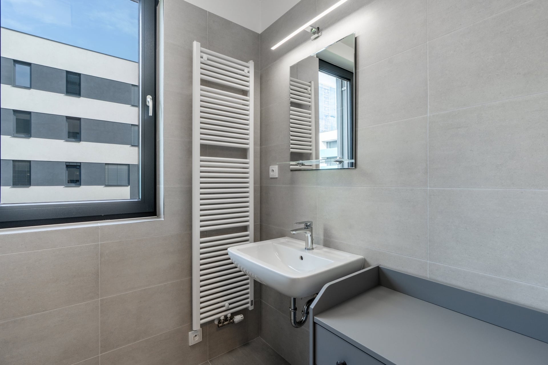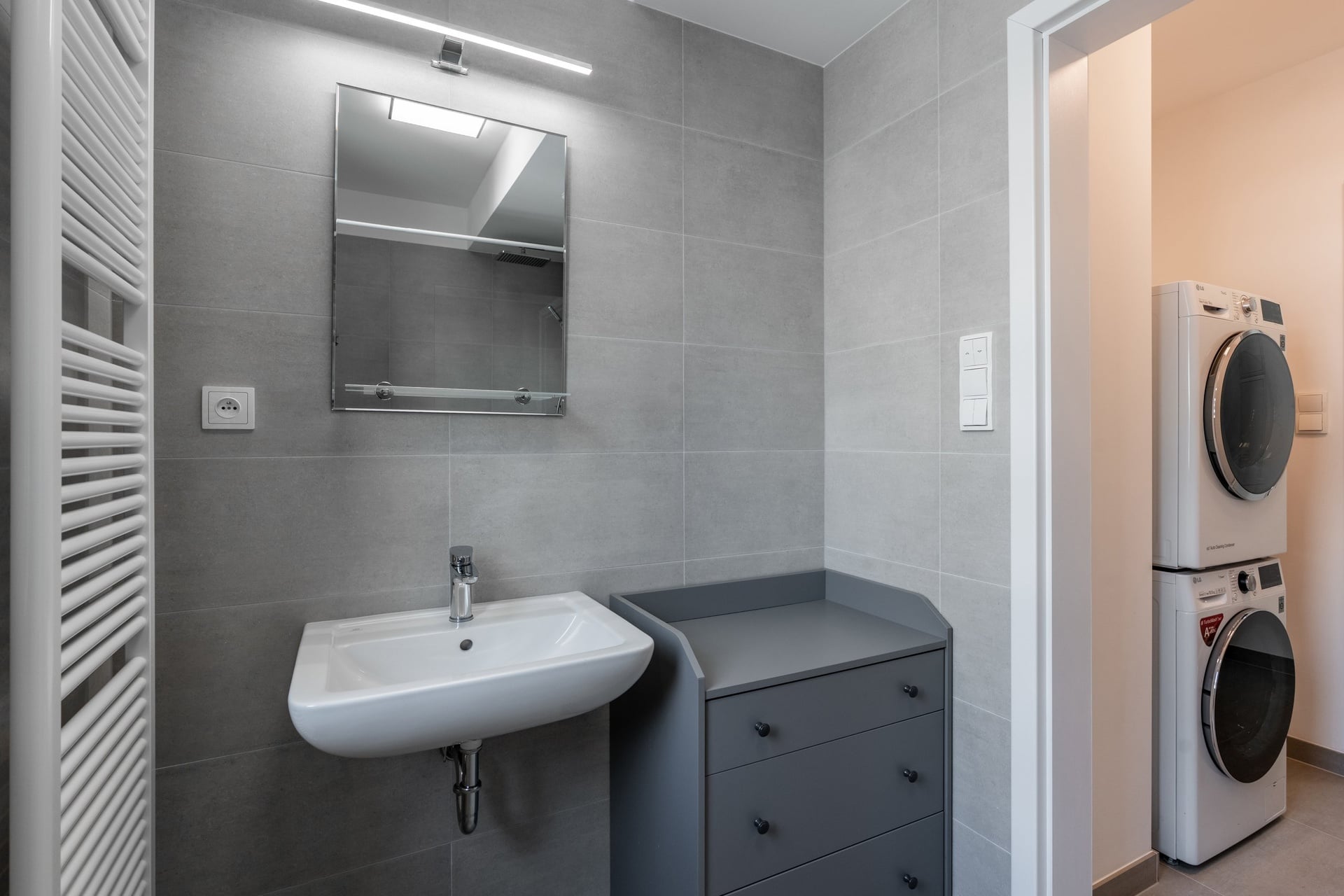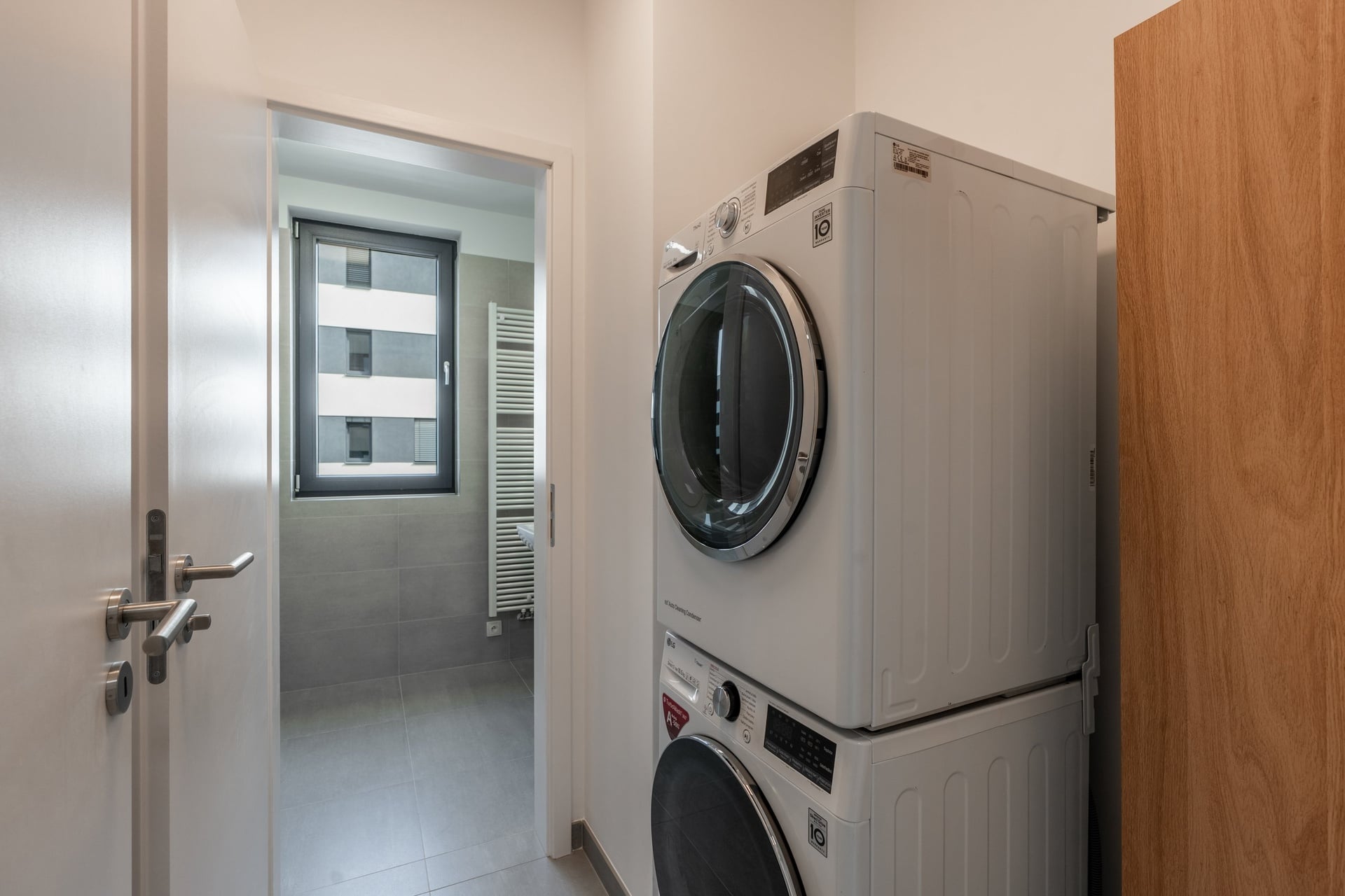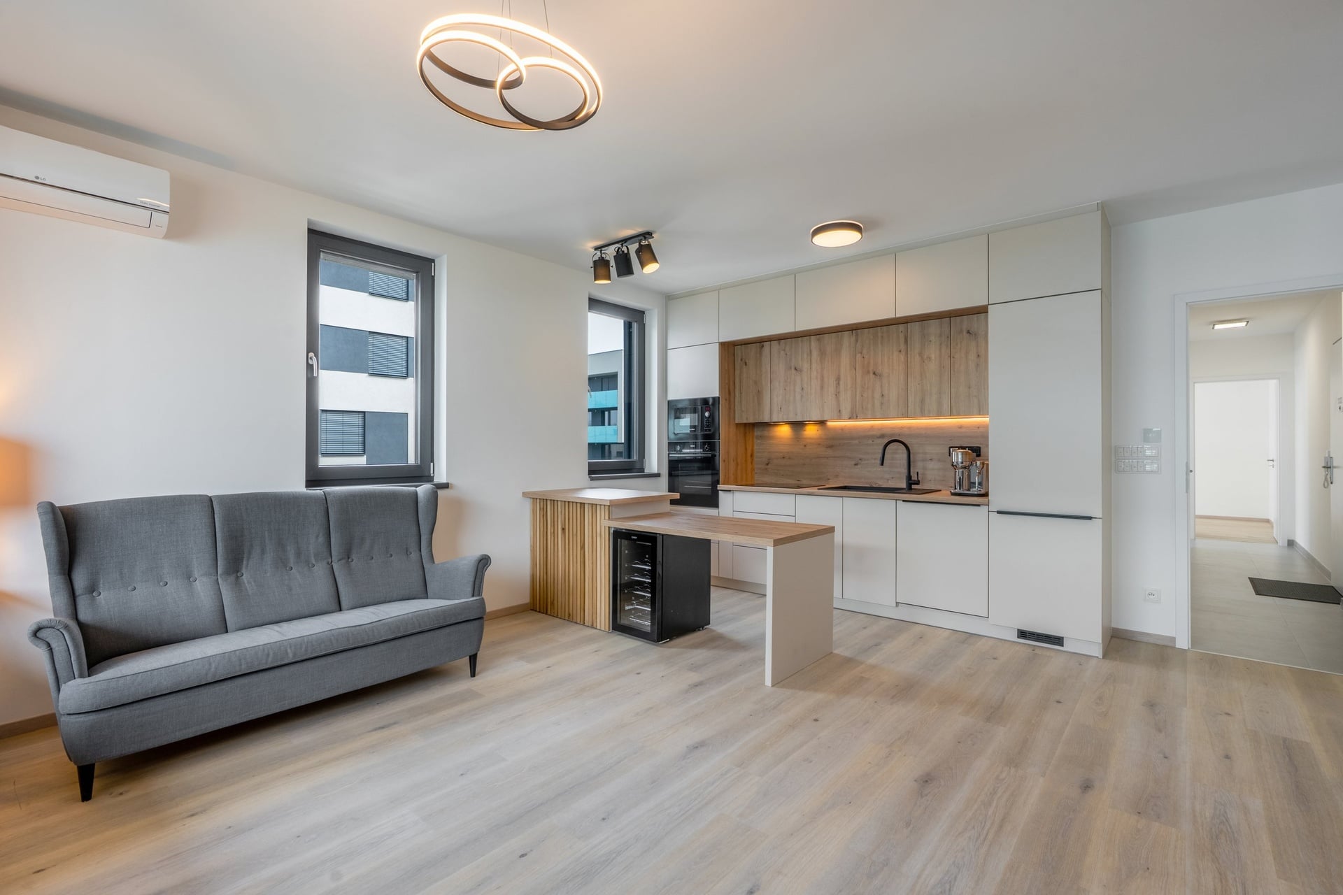 Dispozice zahrnují prostornou obývací místnost s moderním kuchyňským koutem na míru, ložnici, pracovnu či dětský pokoj, vstupní chodbu, koupelnu s vanou, oddělenou toaletu a technickou místnost s pračkou a sušičkou.