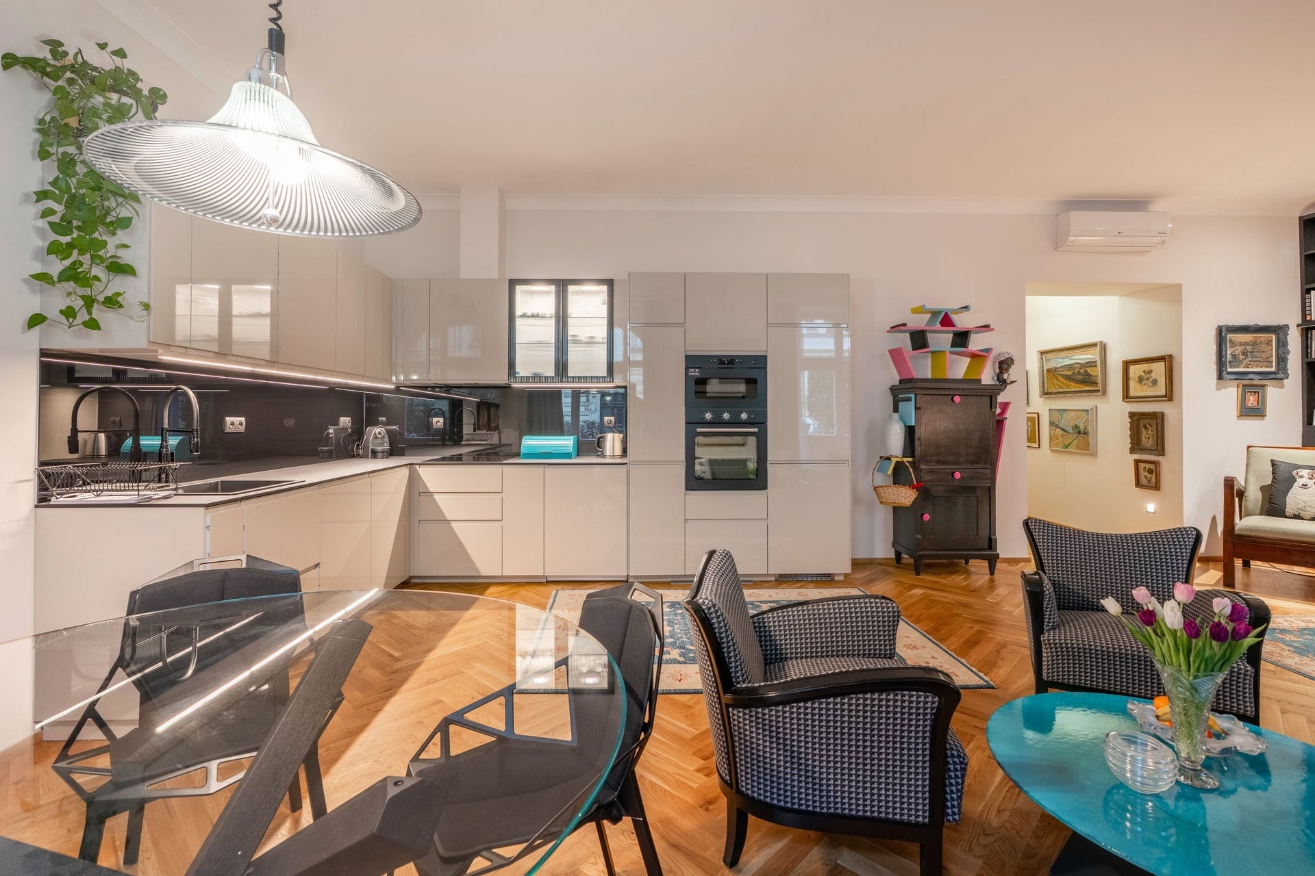 Byt je kompletně zařízený a disponuje kvalitním vybavením, které zajišťuje komfortní každodenní bydlení. Interiér je navržen s ohledem na kombinaci moderního pohodlí a estetického provedení. Součástí je klimatizace, vestavěné úložné prostory, pračka a další spotřebiče pro kompletní domácnost.