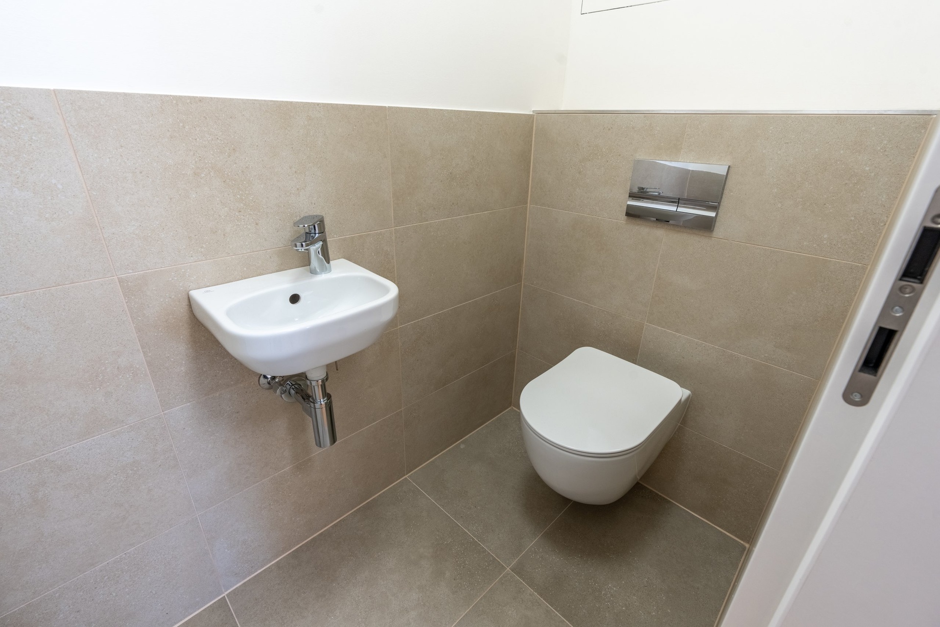Dispozice nabízí vstupní chodbu, koupelnu s vanou a toaletou, dále samostatně oddělenou toaletu pro hosty, ložnici, dětský pokoj a prostorný obývací pokoj s kuchyňským koutem vybaveným všemi spotřebiči. Součástí obývacího pokoje a ložnice je též přístup na terasu s překrásným výhledem do zeleně.