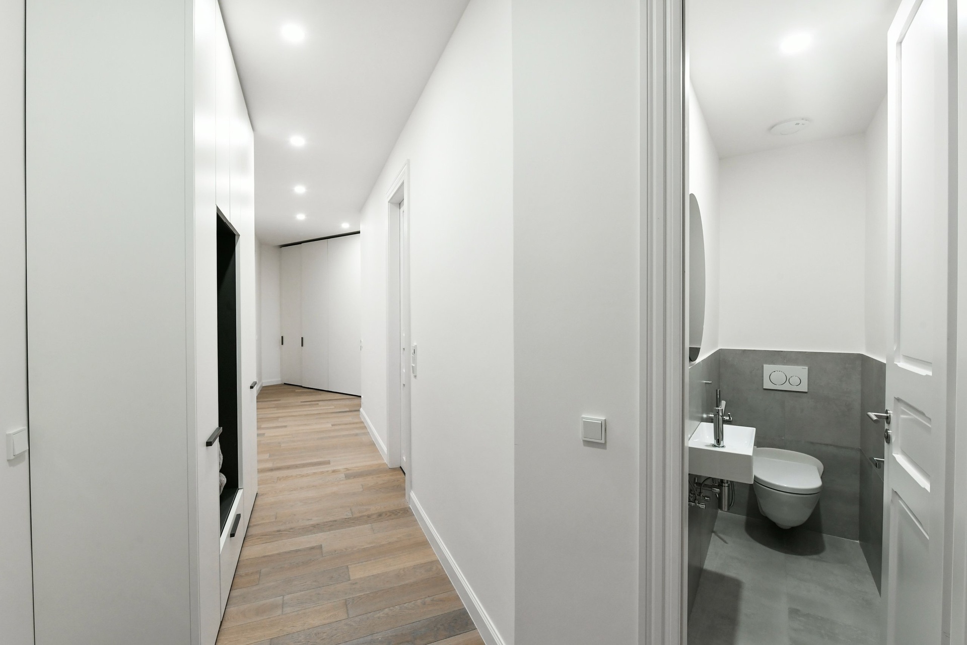 Dispozice nabízí vstupní chodbu, koupelnu se sprchovým koutem, vanou, toaletou a bidetem, master ložnici s en suite koupelnou se sprchovým koutem a toaletou, další ložnici a prostorný obývací pokoj s kuchyňským koutem vybaveným všemi spotřebiči – indukční varnou deskou, digestoří, horkovzdušnou troubou, myčkou a lednicí s mrazákem. Součástí vybavení je i pračka se sušičkou.