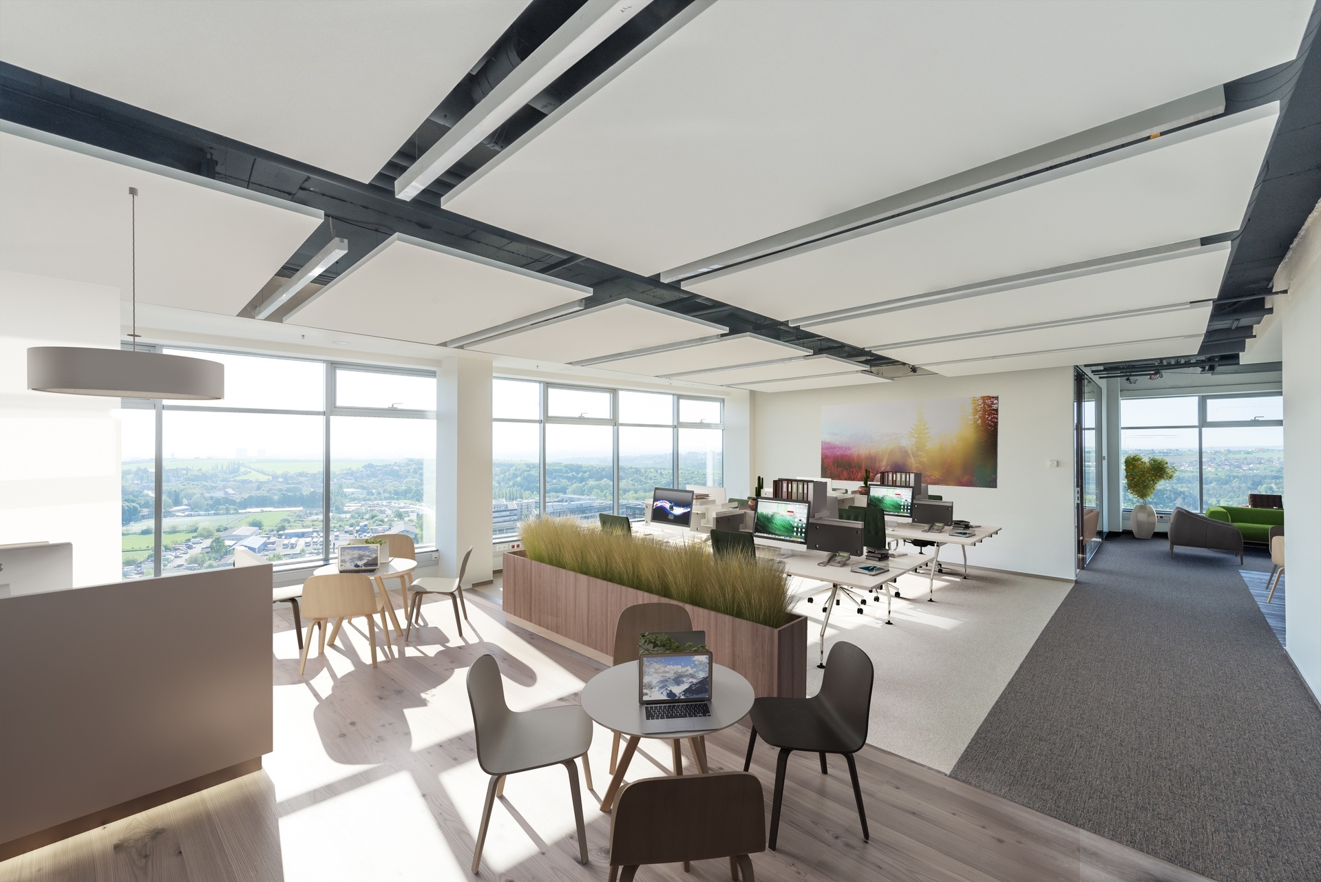 Kancelářské prostory umožňují velkoplošné řešení i možnost uzavřených jednotek, nové snížené stropy a LED osvětlení, efektivní dělení kanceláří s modulem 1,35 m, samostatnou kuchyňku pro každého nájemce a vysokorychlostní výtahy.